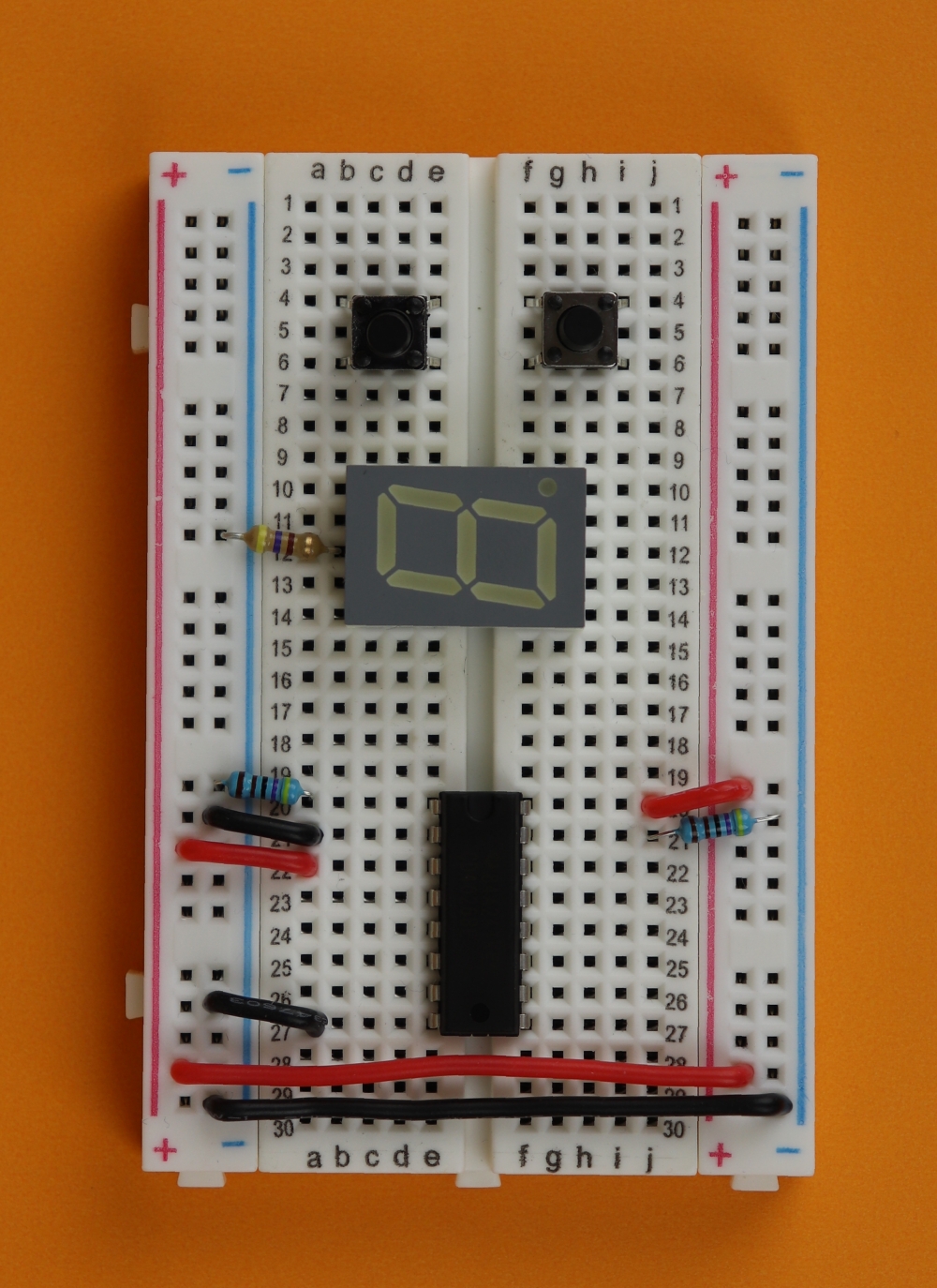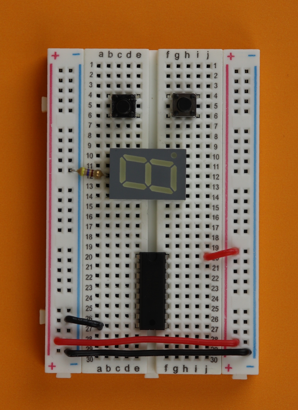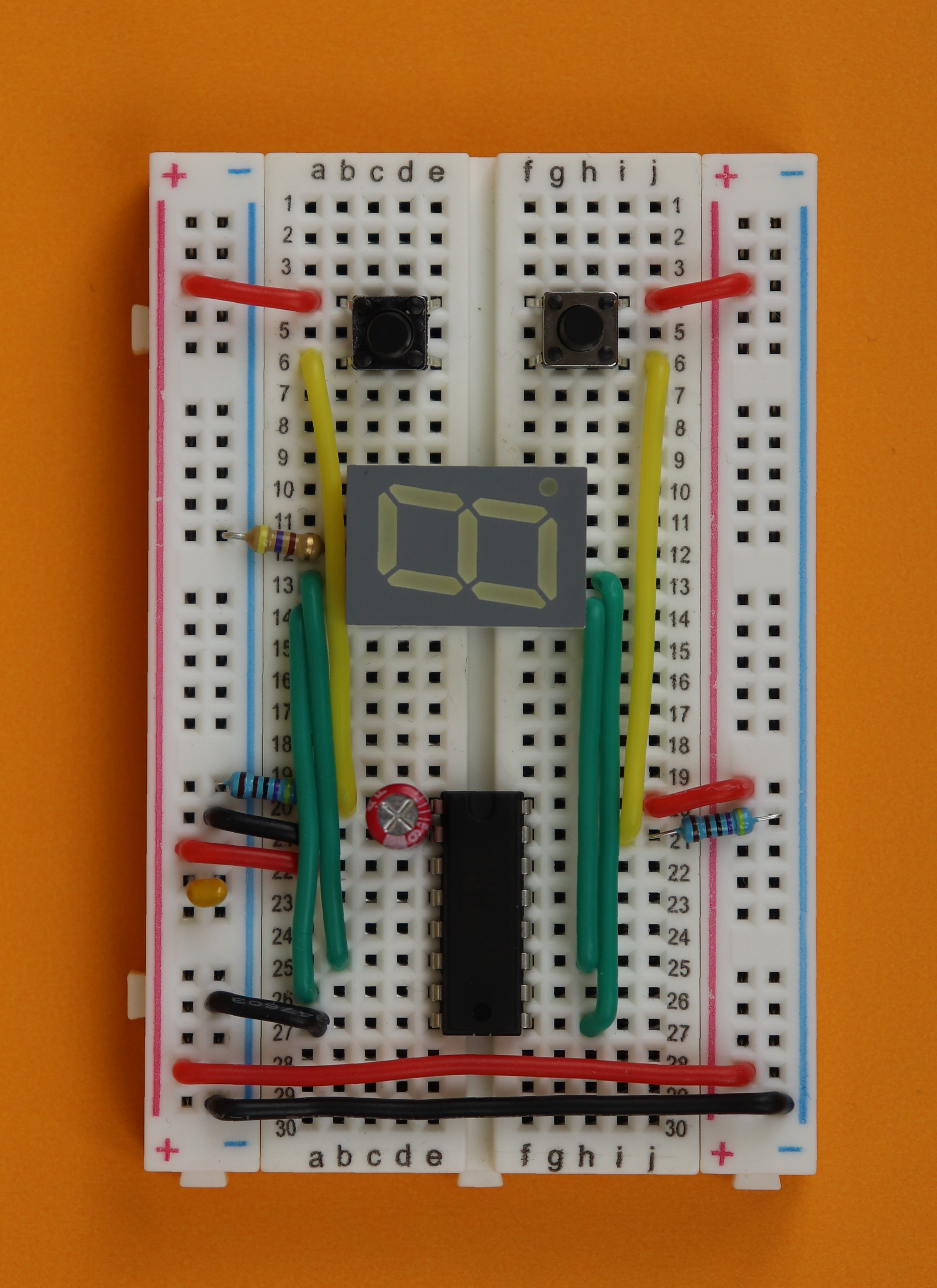 The CD4026 is an integrated circuit (IC) that works as a counter from 0-9 with an integrated decoder for a 7-segment display. I think it is an ideal beginner circuit for anybody who wants to learn electronics. In this tutorial we will go through the very basics of this IC and learn, step by step, how to connect it to pushbuttons, a 7-segment display, and a battery, to build our own counter!