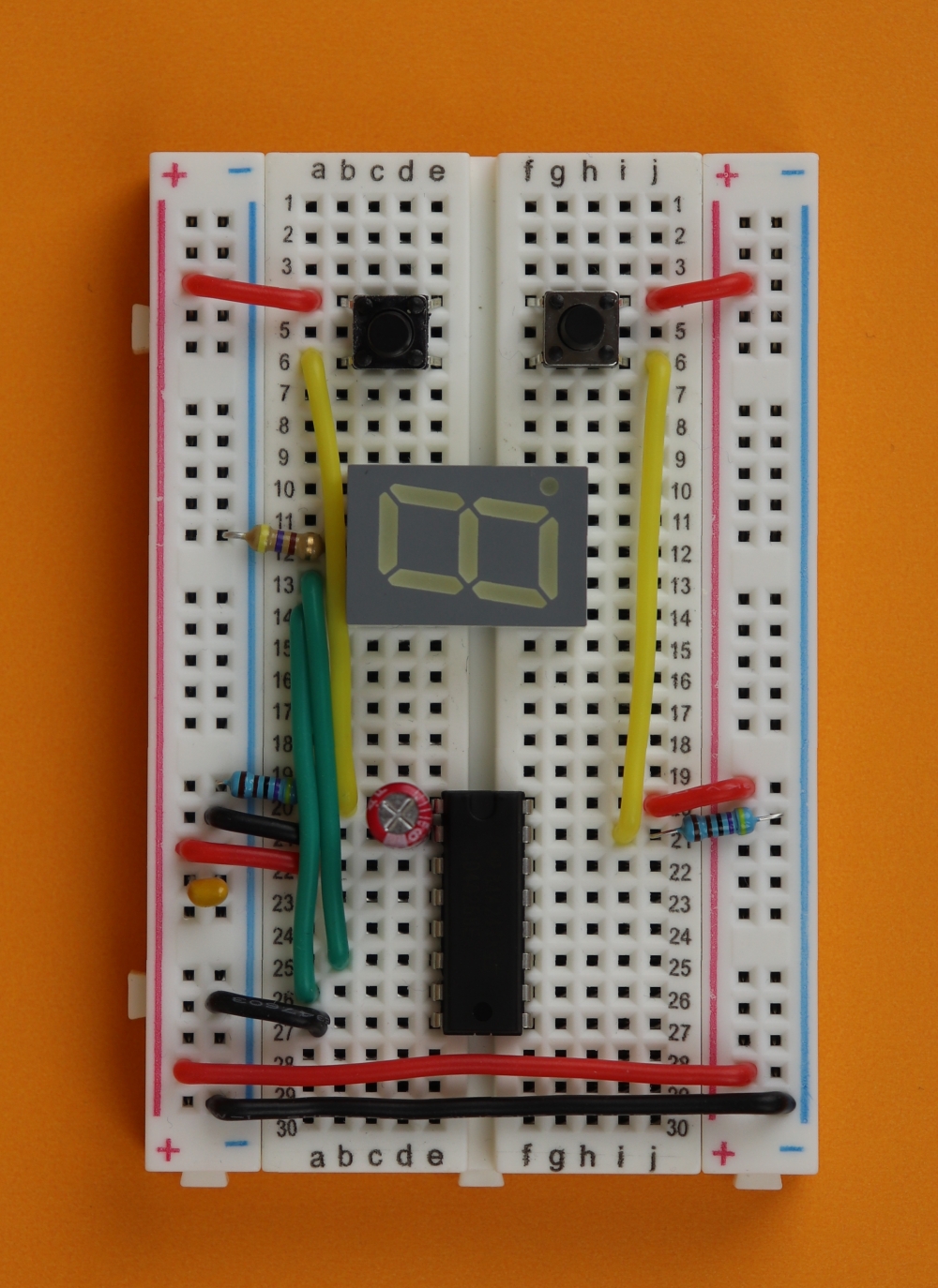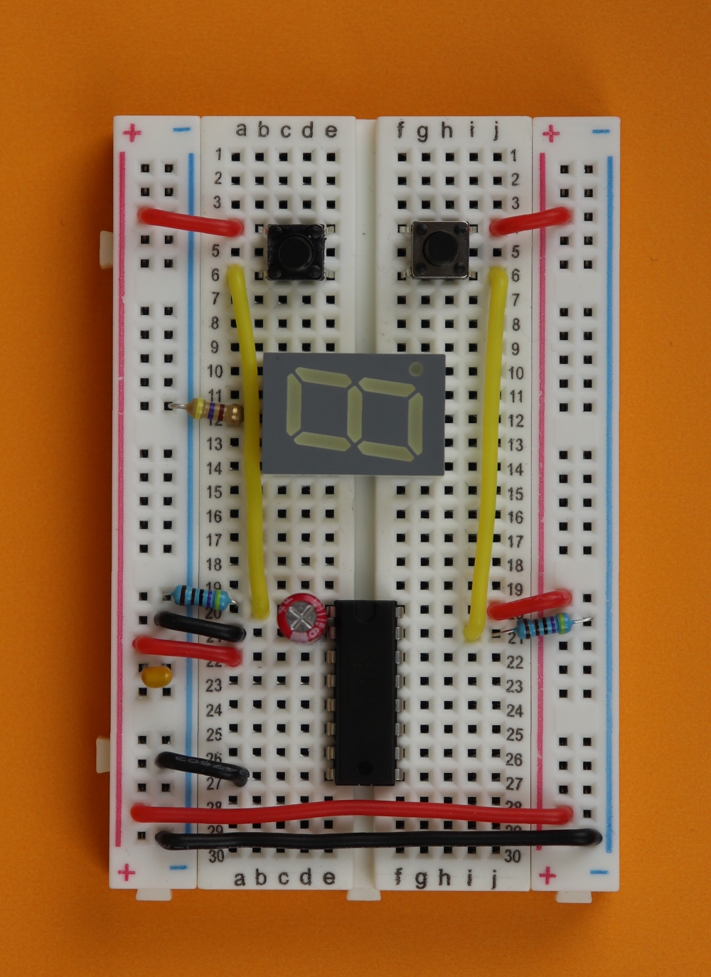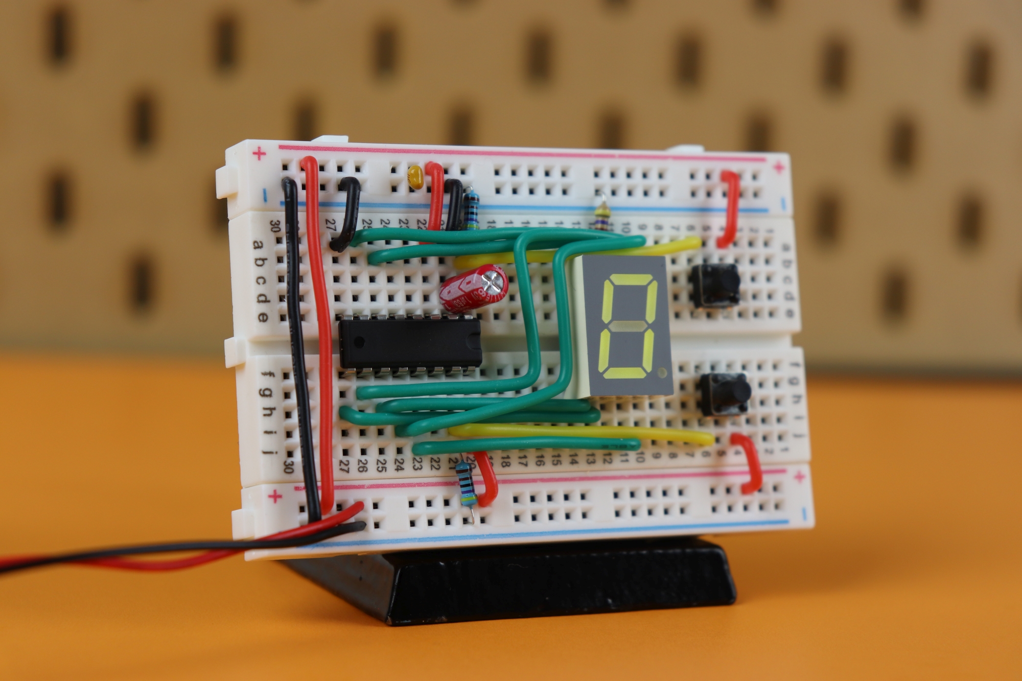 The CD4026 is an integrated circuit (IC) that works as a counter from 0-9 with an integrated decoder for a 7-segment display. I think it is an ideal beginner circuit for anybody who wants to learn electronics. In this tutorial we will go through the very basics of this IC and learn, step by step, how to connect it to pushbuttons, a 7-segment display, and a battery, to build our own counter!