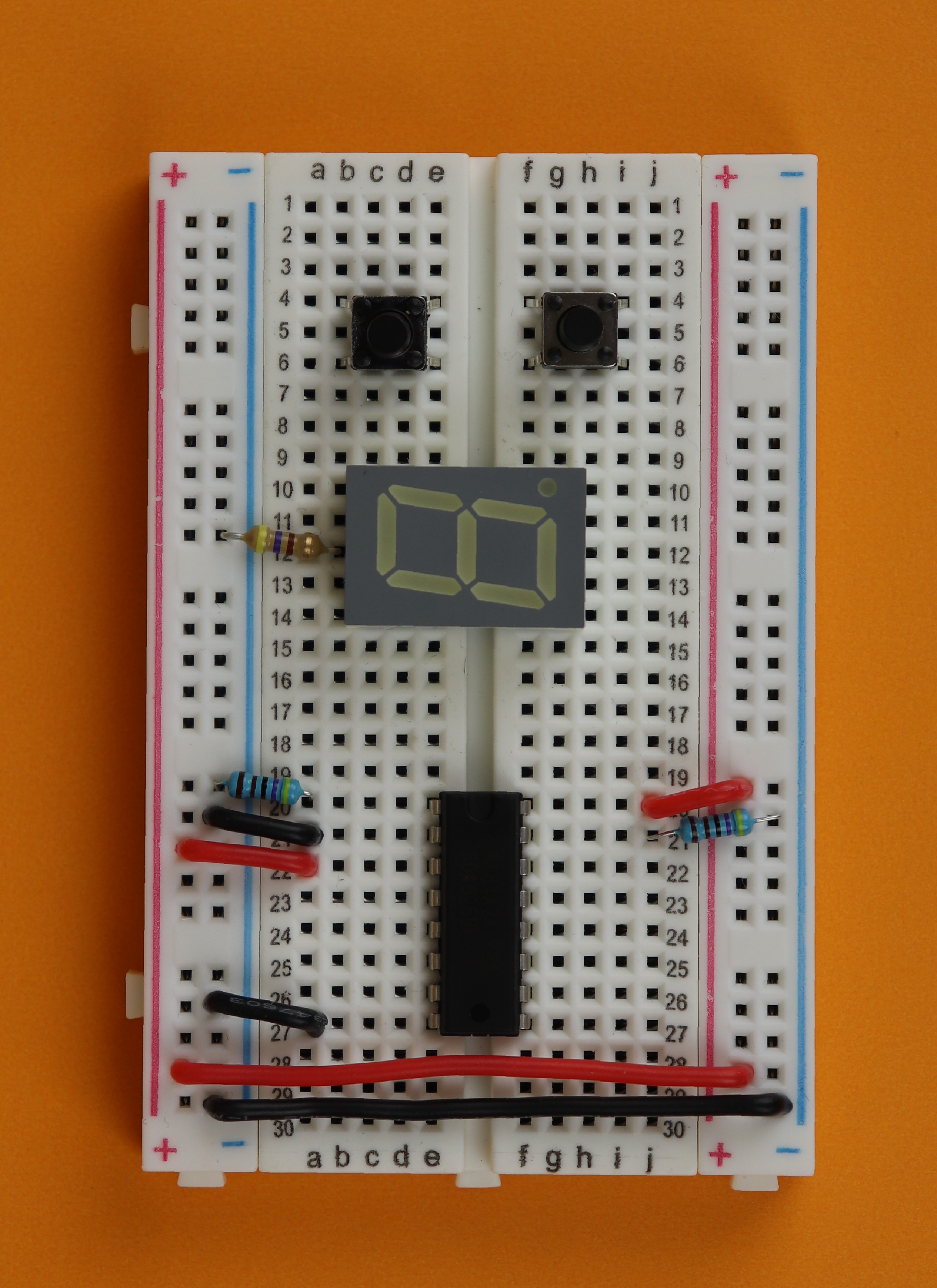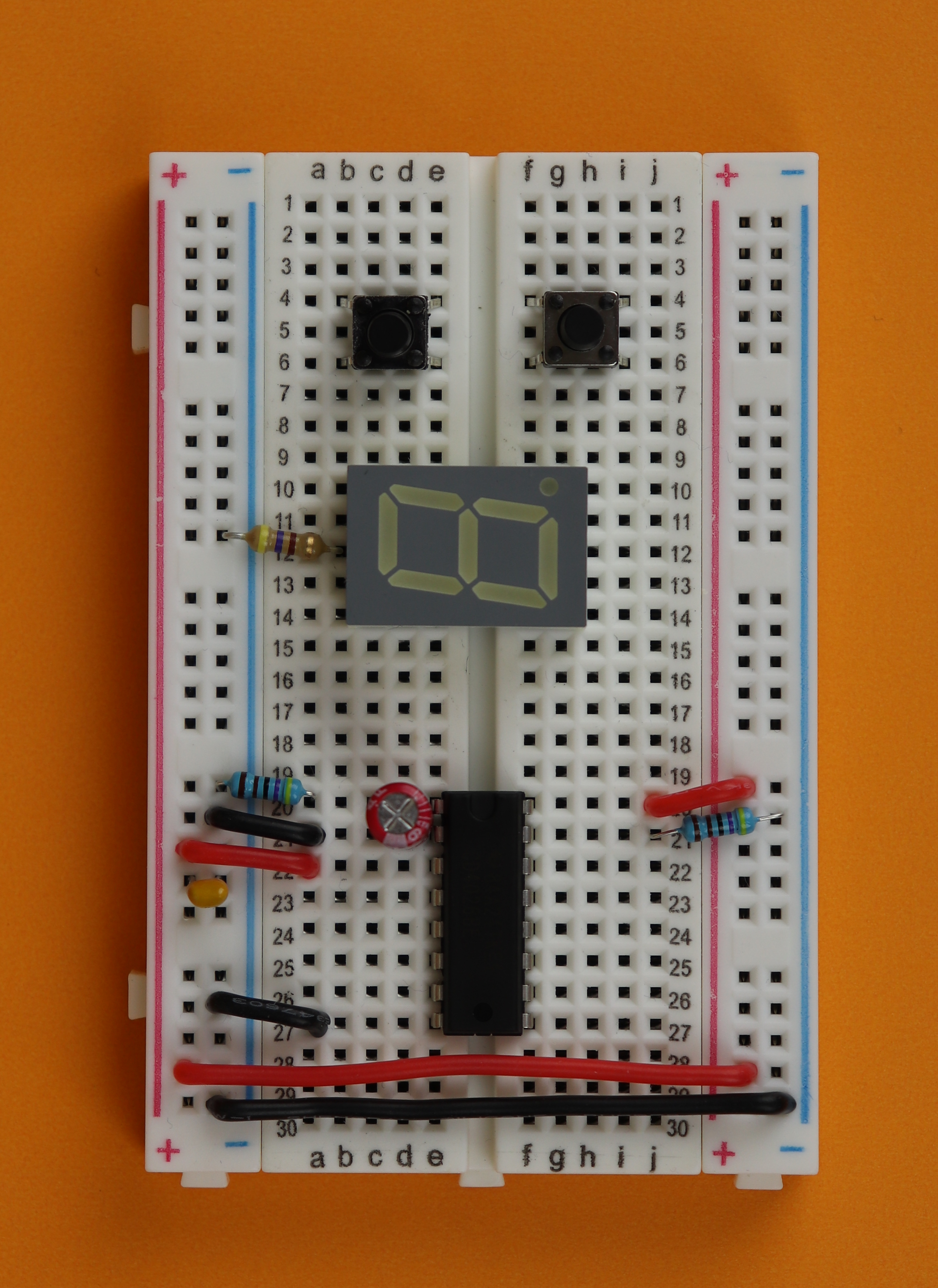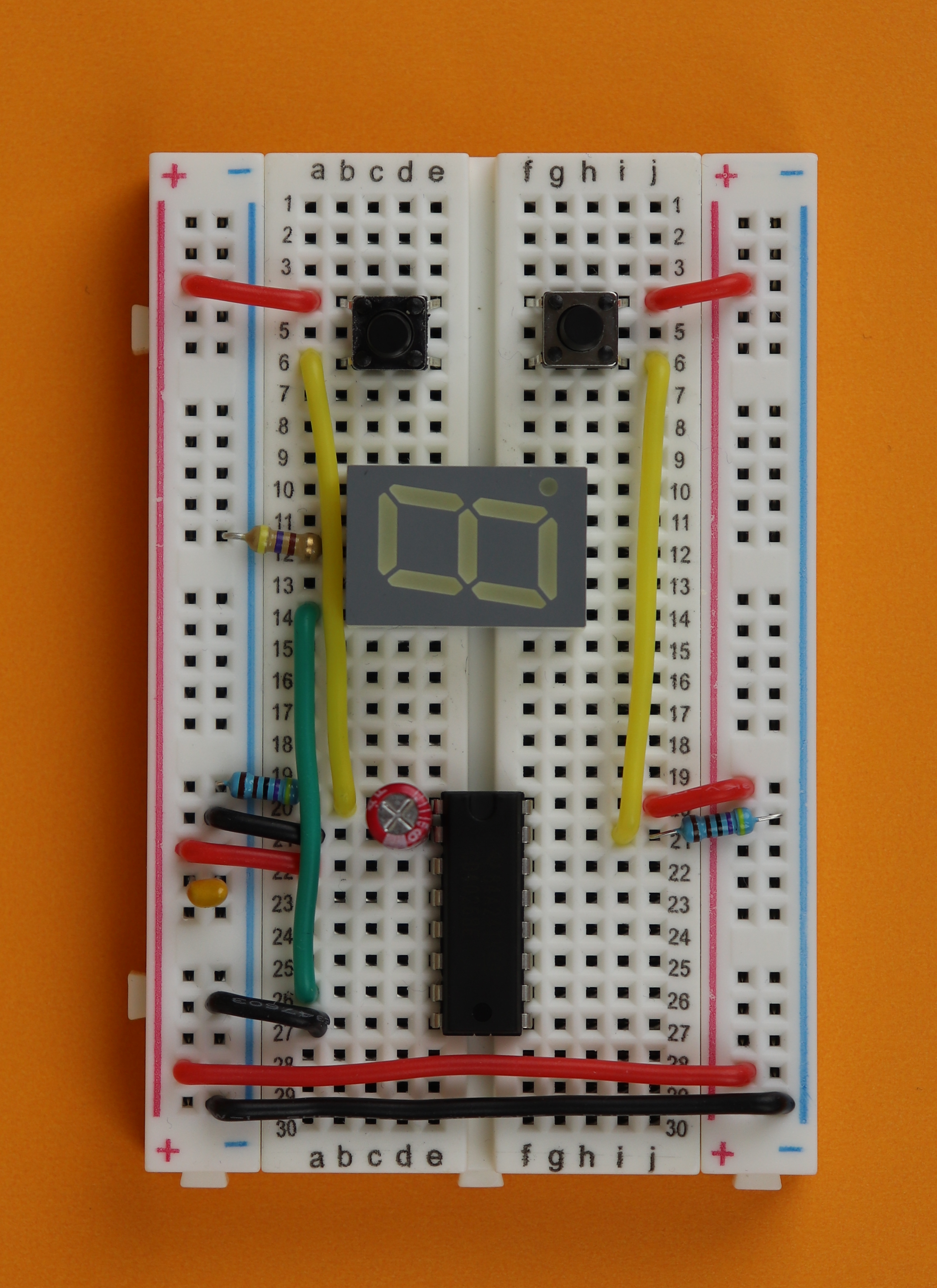 That happens a lot. Make sure that pin 2 (clock inhibit) is connected to ground (step 8). Also double check that the pulldown resistor at the reset pin (pin 15 of the CD4026) is actually connected to ground and not to +9V (step 9). Also make sure your pushbuttons work. Is the pushbutton inserted correctly? There is only one way to insert tactile switches into the breadboard, but perhaps you were overly ambitious and rammed it in? Make sure the orientation of the switch matches that of the pictures :) Sometimes (very rarely) it can happen that there is a mechanical defect in your pushbutton. If you think that is the case, remove the pushbutton and connect two wires to rows 4 and 6. Does the counter increase if you connect these wires manually? If yes, then your pushbutton is dead. - Problem: The counter does not reset.