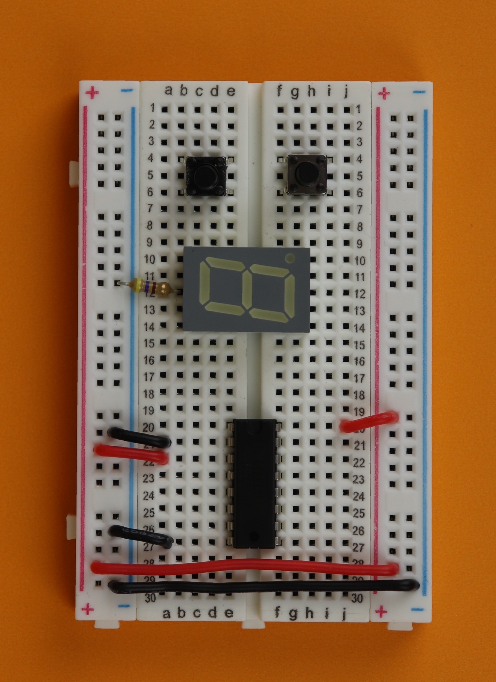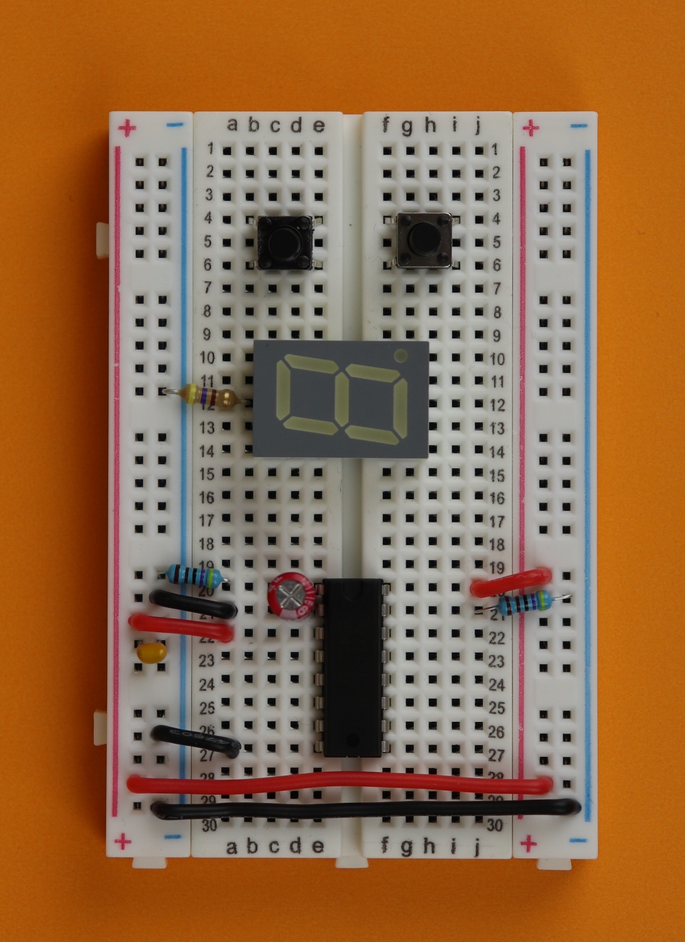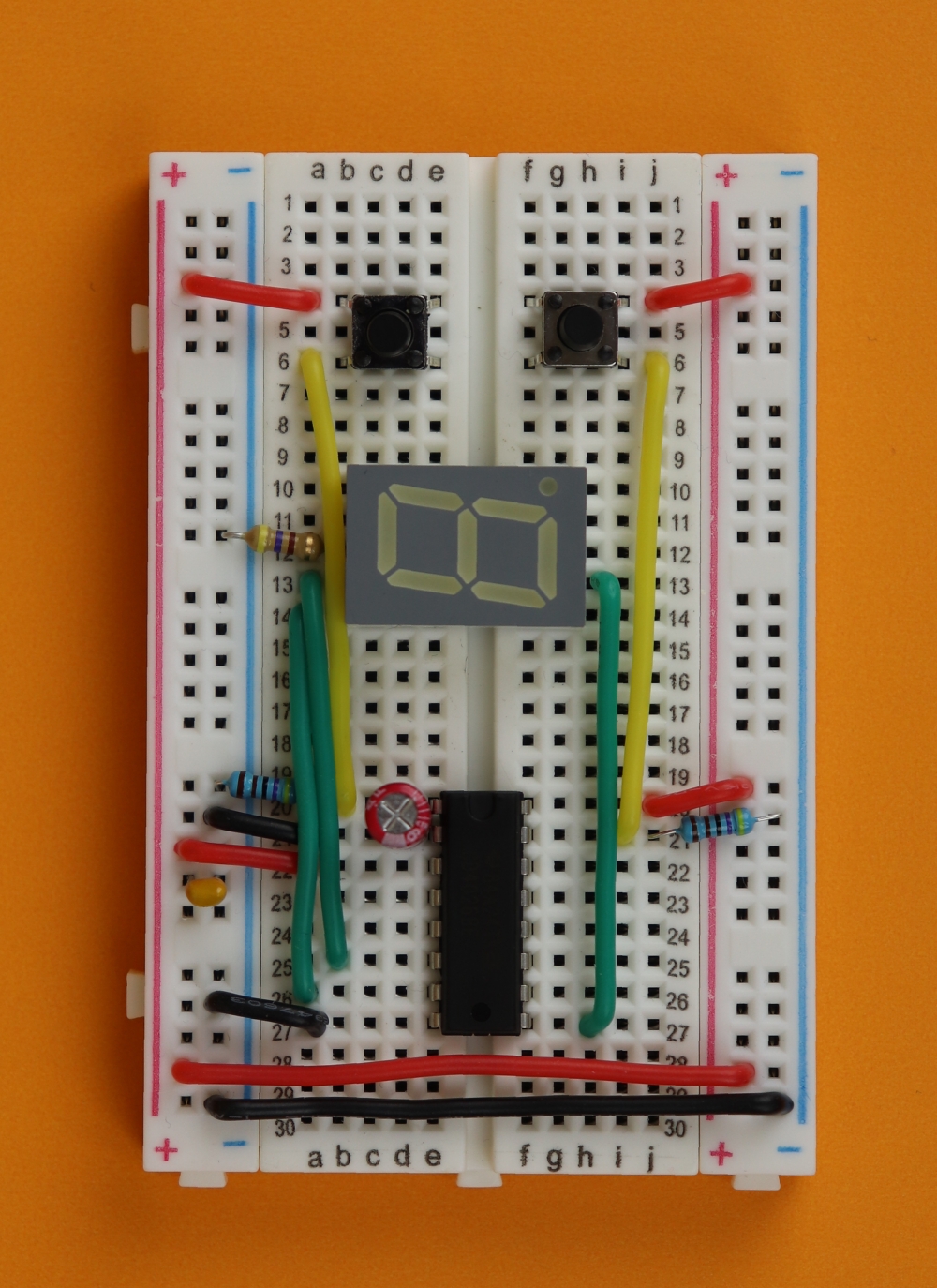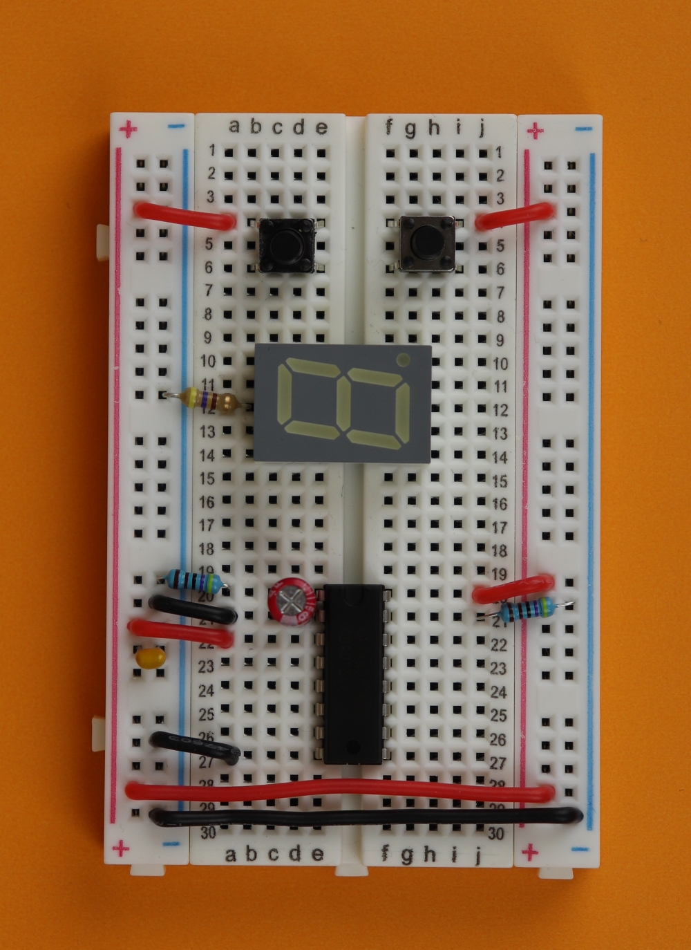 That happens a lot. Make sure that pin 2 (clock inhibit) is connected to ground (step 8). Also double check that the pulldown resistor at the reset pin (pin 15 of the CD4026) is actually connected to ground and not to +9V (step 9). Also make sure your pushbuttons work. Is the pushbutton inserted correctly? There is only one way to insert tactile switches into the breadboard, but perhaps you were overly ambitious and rammed it in? Make sure the orientation of the switch matches that of the pictures :) Sometimes (very rarely) it can happen that there is a mechanical defect in your pushbutton. If you think that is the case, remove the pushbutton and connect two wires to rows 4 and 6. Does the counter increase if you connect these wires manually? If yes, then your pushbutton is dead. - Problem: The counter does not reset.