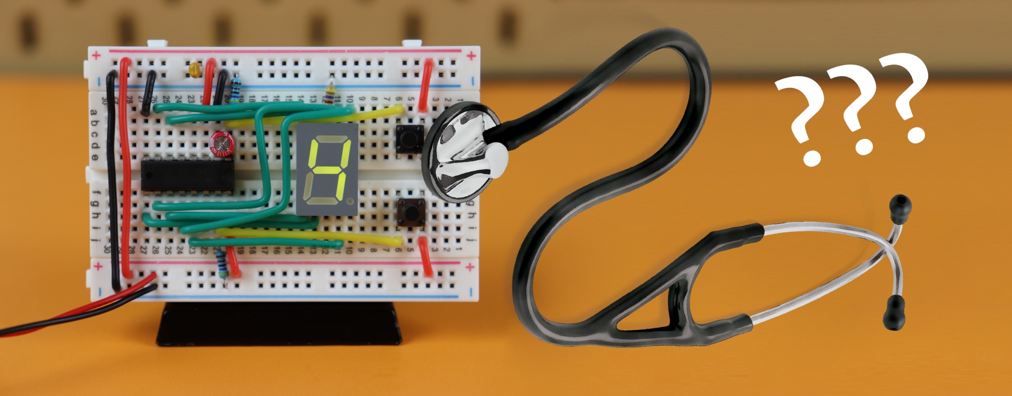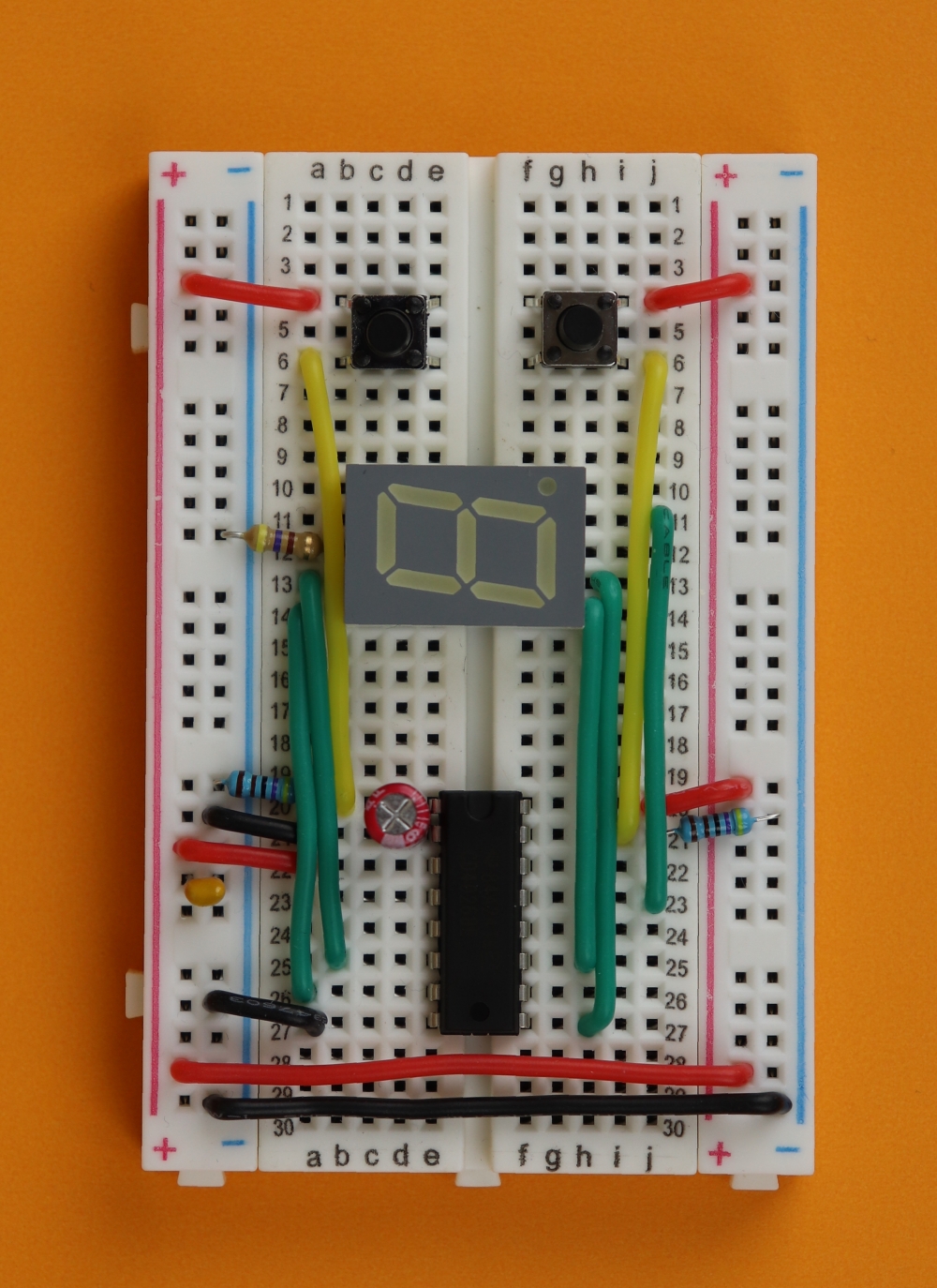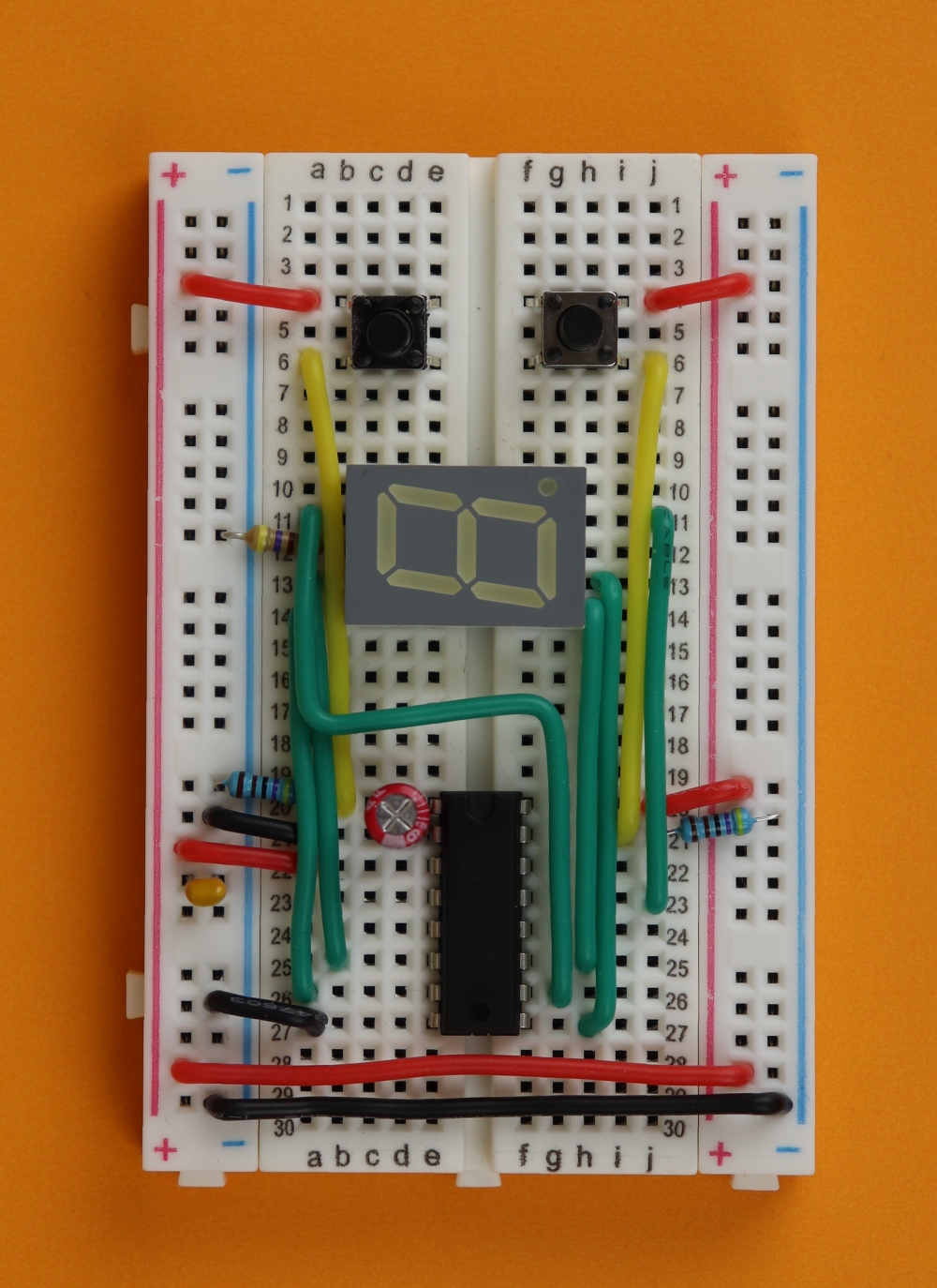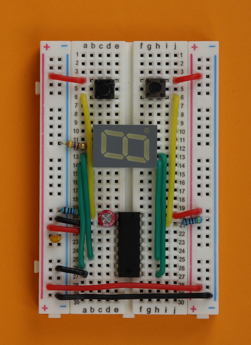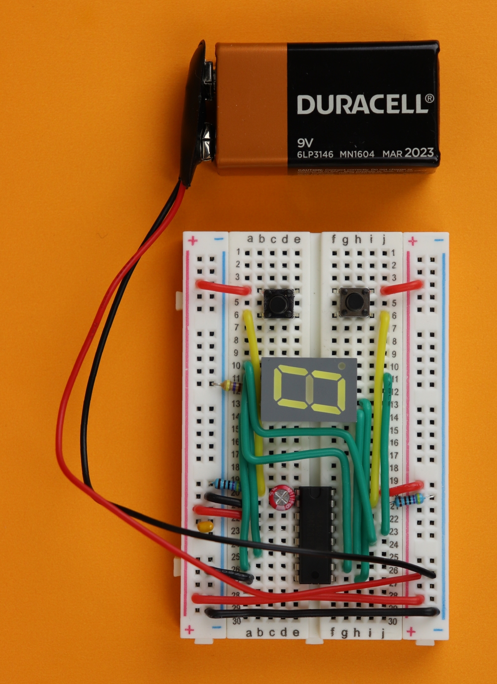 First, check that your battery has any juice left :) Make sure the power rails on both sides are connected properly (step 1). Also make sure that the “display enable in” pin of the CD4026 is connected to +9V (step 8). Also check if pin 8 of the 7-segment display is connected to ground via the 470Ω resistor (step 6). - Problem: The counter does not increment.