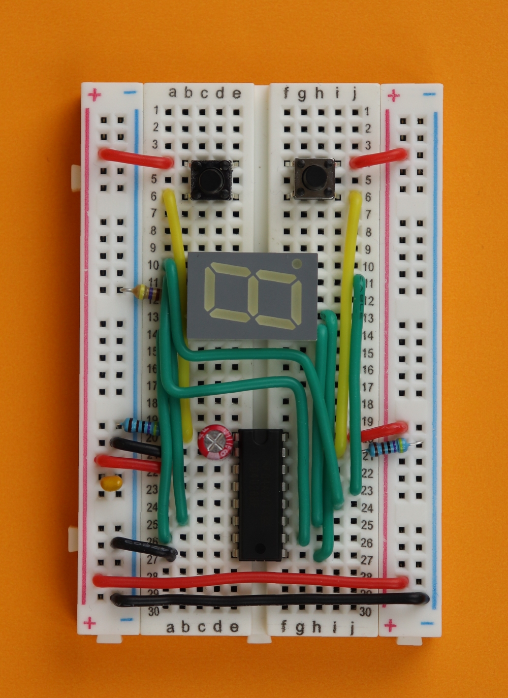 - LED1 is our 7-segment display with a common cathode. The resistor R3 limits the current that flows through the LEDs. It is not a very clean solution: we should add a separate resistor for each segment. This way we save on the number of total components (because we need only one current-limiting resistor as opposed to seven), but the trade off is that the display will have slightly uneven brightness: the digit 1 will be brighter than the number 8, because in case of the number 1 only two segments share the current, whereas for number 8 all seven segments share the current. if you build it yourself, feel free to add separate resistors :)