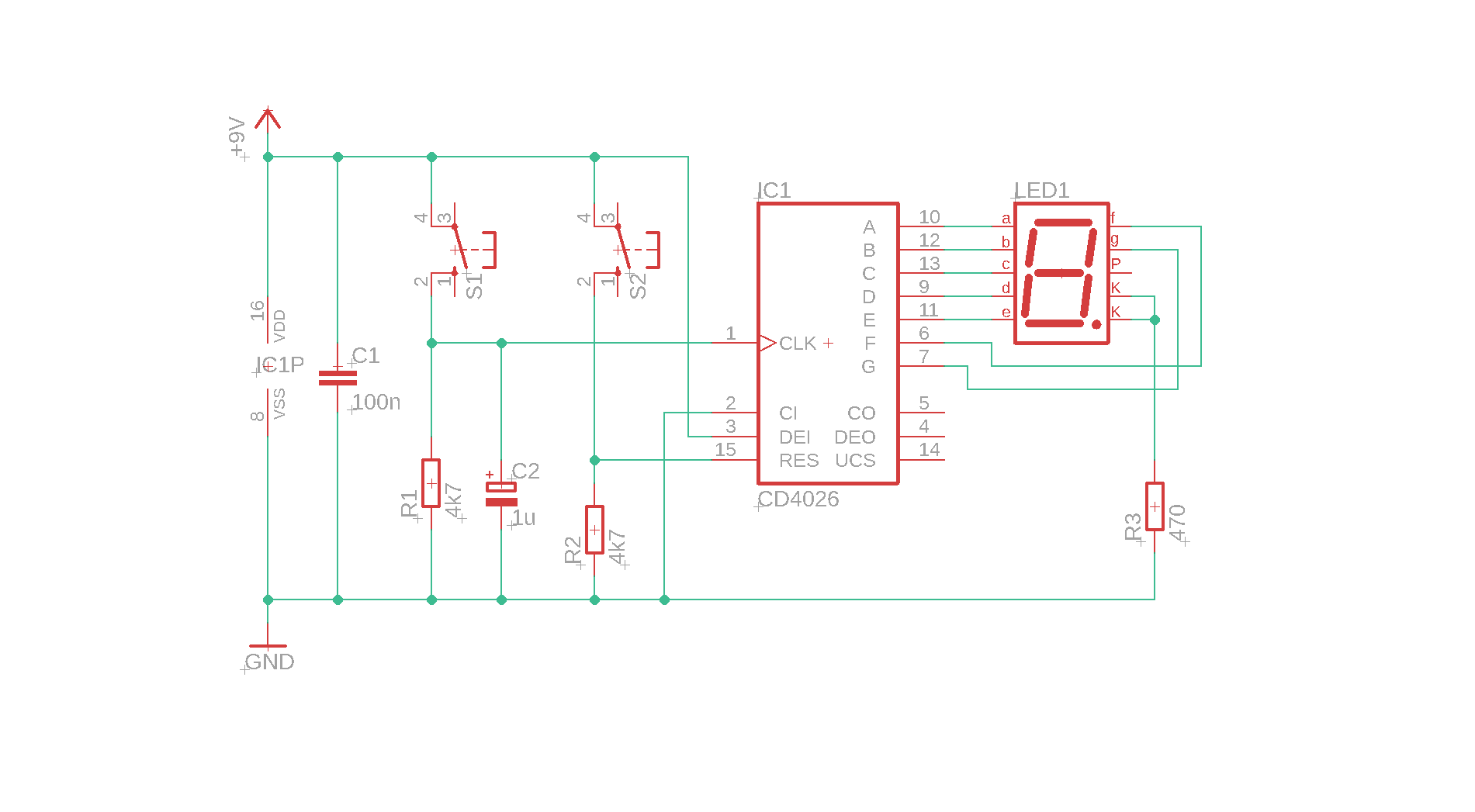 - IC1P on the very left is not a separate component, but it stands for the power connections for the CD4026. This is a bit confusing, but for CMOS ICs the power connections are usually displayed as separate symbols (see also our article here).