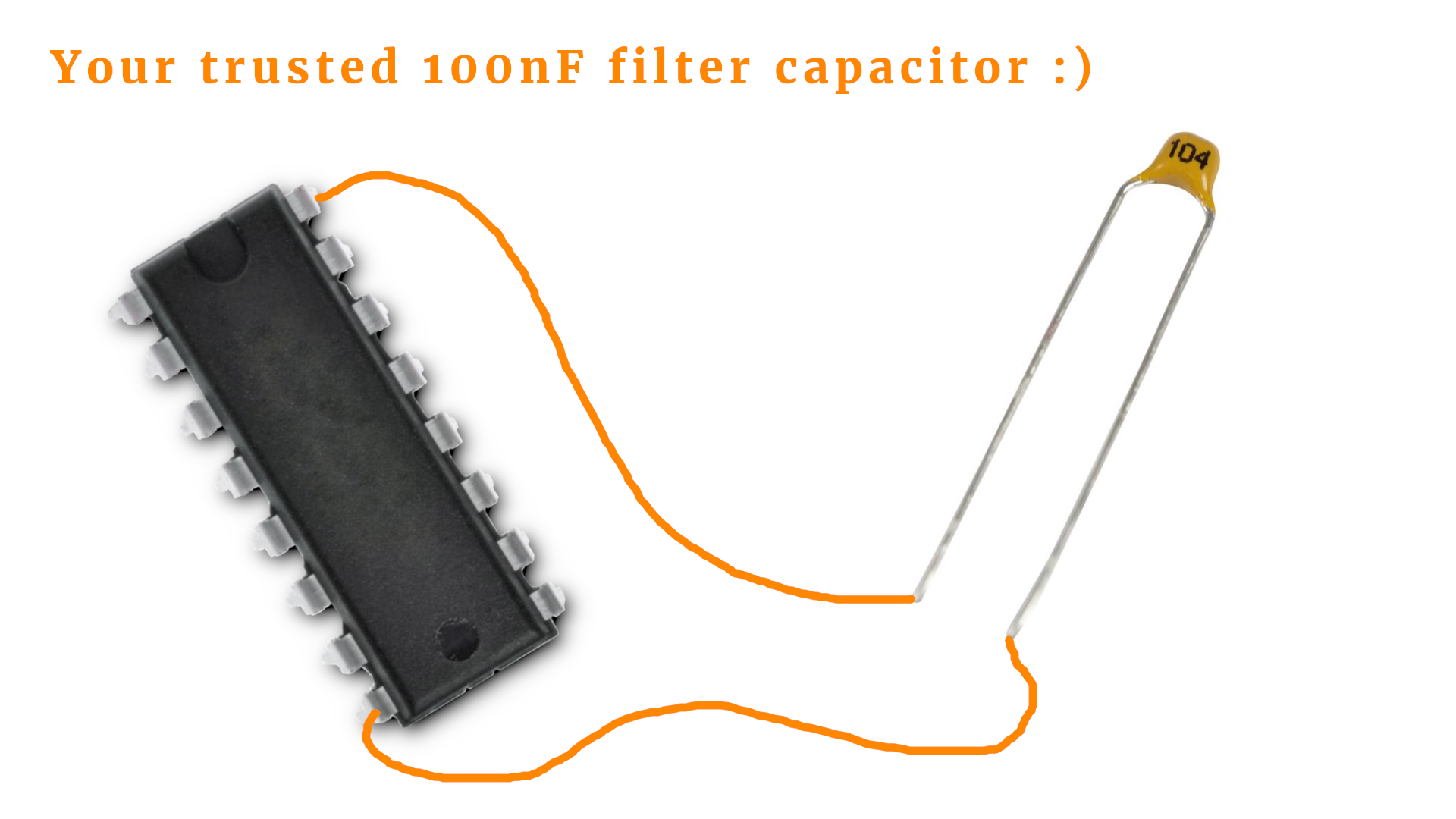 Okay, but what about that weird 100nF capacitor? In a perfect world we wouldn't need it, but more often than not the power supply rail is a bit noisy, meaning that the supply voltage is not 100% stable. Some CMOS ICs really don't like that, and small capacitors can help smooth out those fluctuations:
