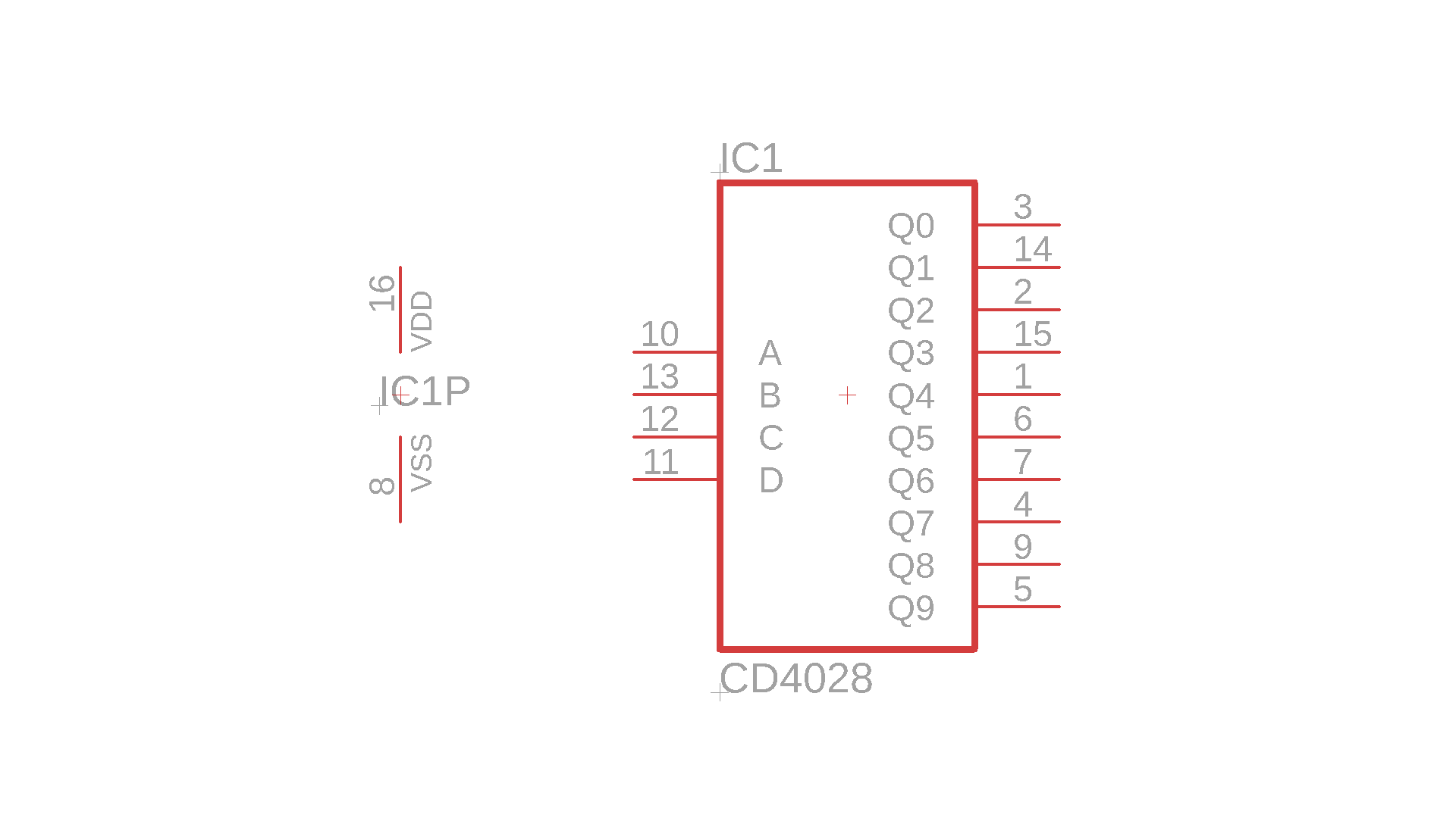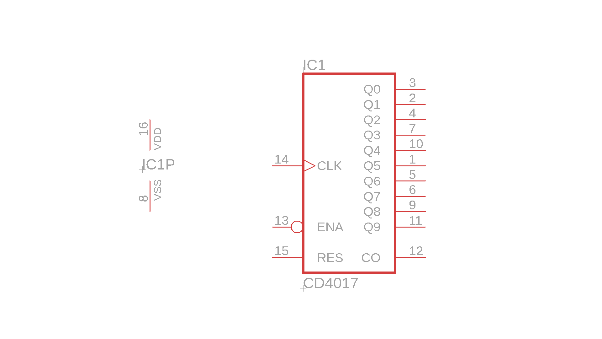 - Q0-Q9: the current counter value in decimal, meaning that only one of these outputs is on at one time.