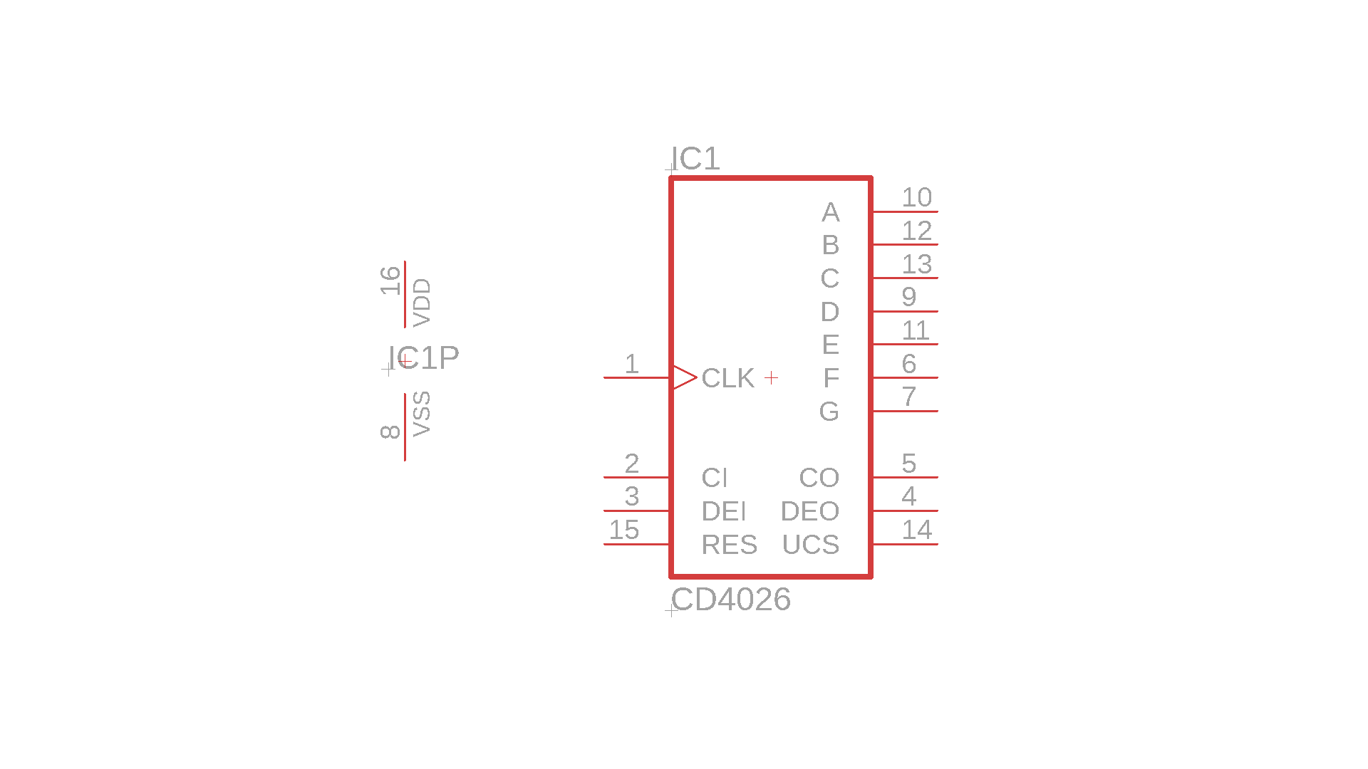 - A-G: these pins output the current counter value encoded in seven segments a-g.