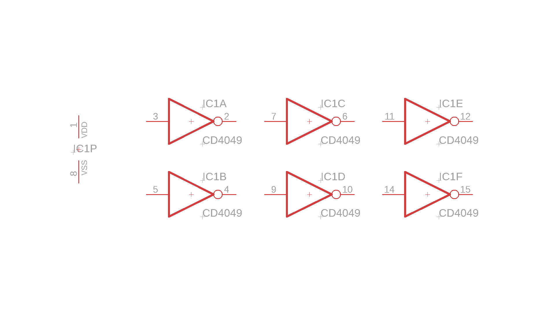 All these six devices are included in the package of one CD4049 chip, which is quite convenient. Each one of these simply inverts the signal at the input. Let's look at the first inverter, here called IC1A. If pin 3 is high then pin 2 is low, and if pin 3 is low then pin 2 is high. You get the idea :)