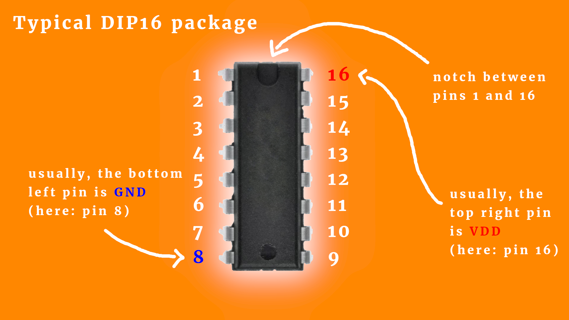 CMOS IC packages can be classified by the number of pins. A package with 16 pins is called DIP16, and so on. Pin 1 is the top left pin, and pin 16 is the top right. Between these two pins you can find a pronounced notch. Sometimes you also find a smaller mark between the bottom two pins, but this is just a leftover from the injection molding of the plastic housing and should not be confused with the notch. Generally, the GND pin is usually at the bottom left, and VDD is the top right.