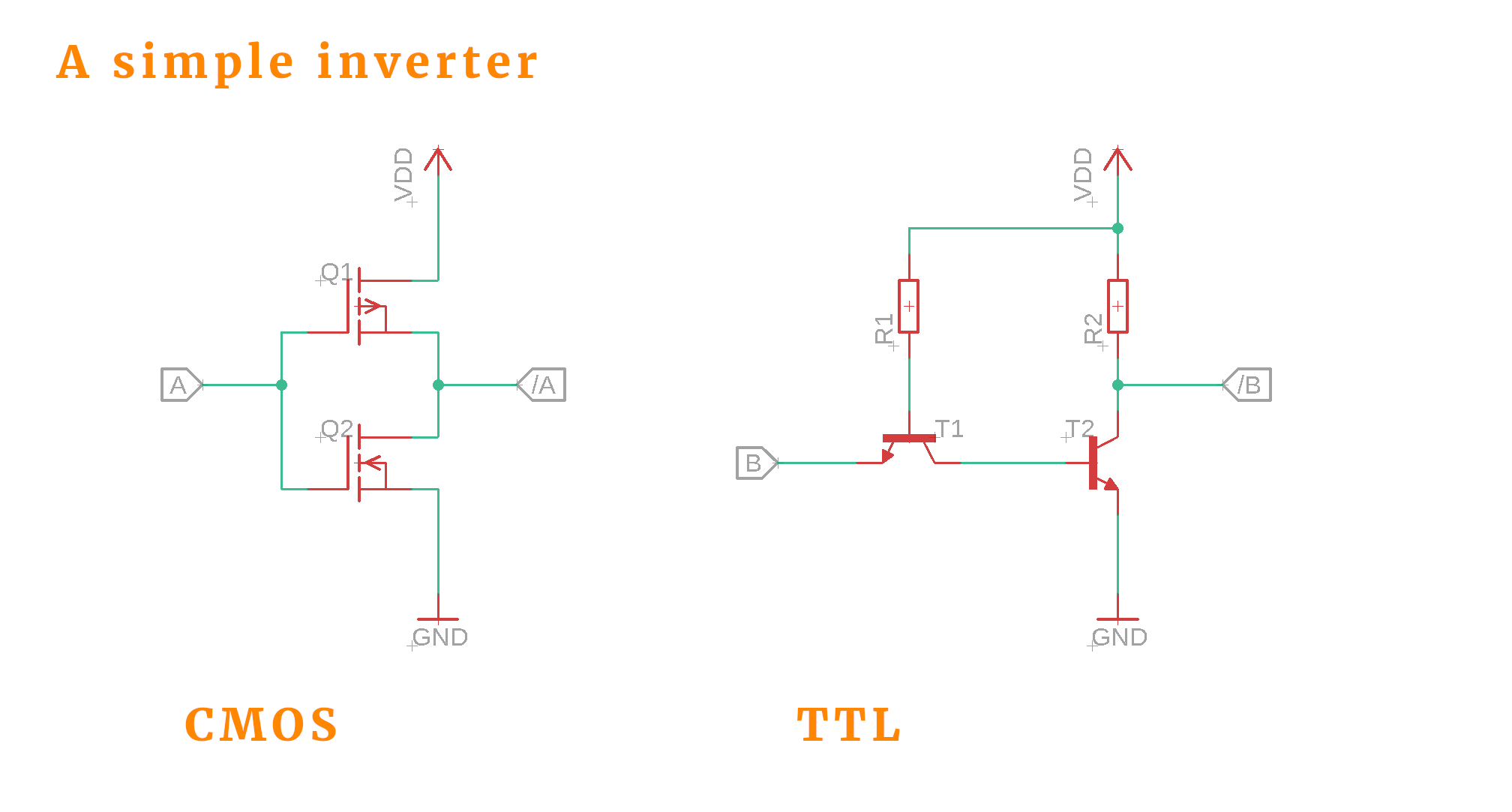 Here you can see a simple inverter in CMOS (left) and TTL (right). They each take an input, call it A, and transform it to its logical opposite, call it A. Here you can see the schematic: