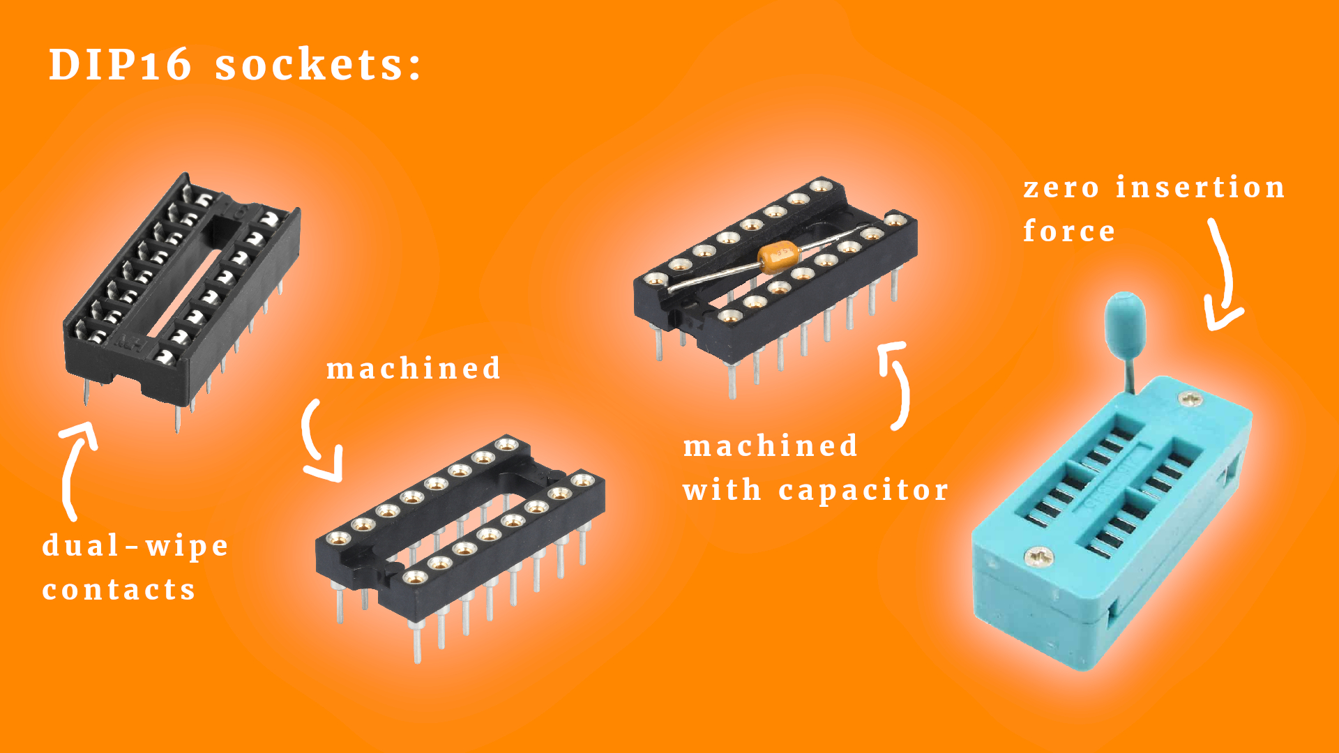 When using breadboards you can just plug in CMOS ICs into the breadboard directly. When using a printed circuit board (PCB) it is sometimes helpful to work with a matching socket instead. If the IC breaks, for some reason, it will be easier to replace it. here you can see a selection of sockets for the DIP16 package: