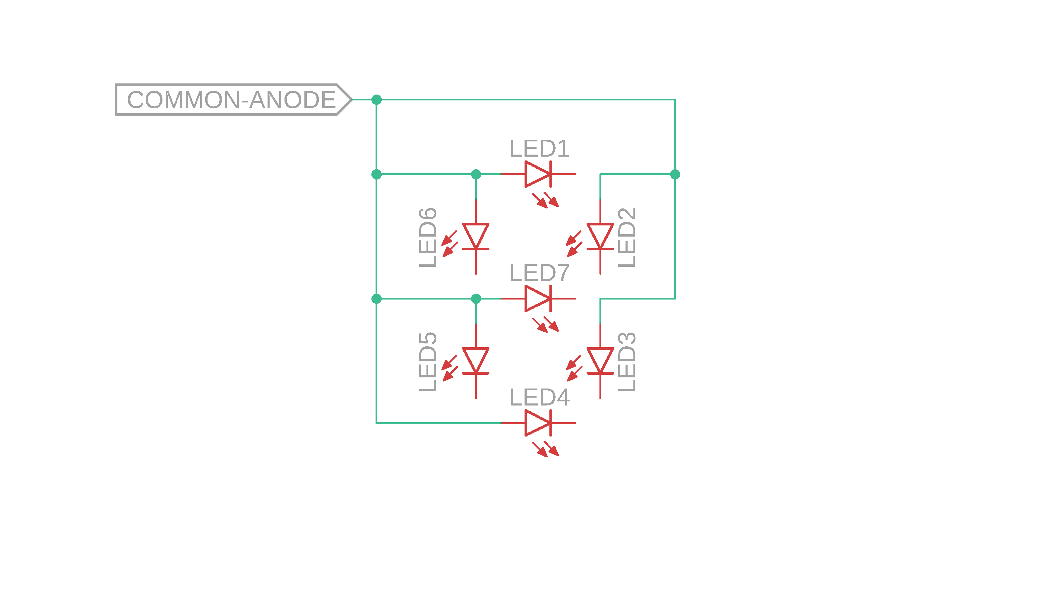 - Speaking of LEDs, those are all collected in the 7-segment display LED1. It is a common anode model, which is very important. This circuit won't work for common cathode displays.