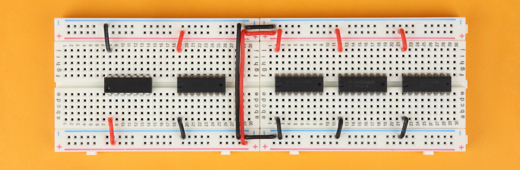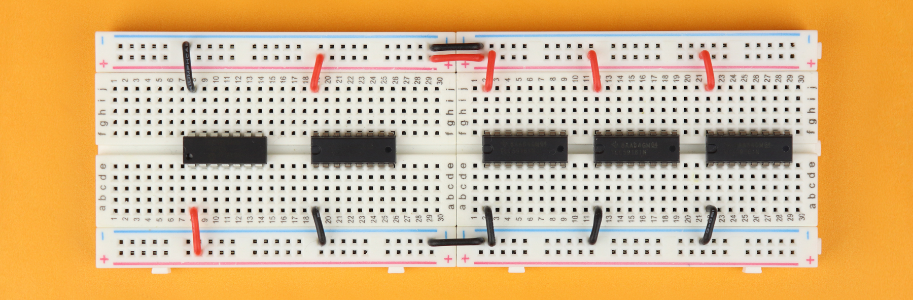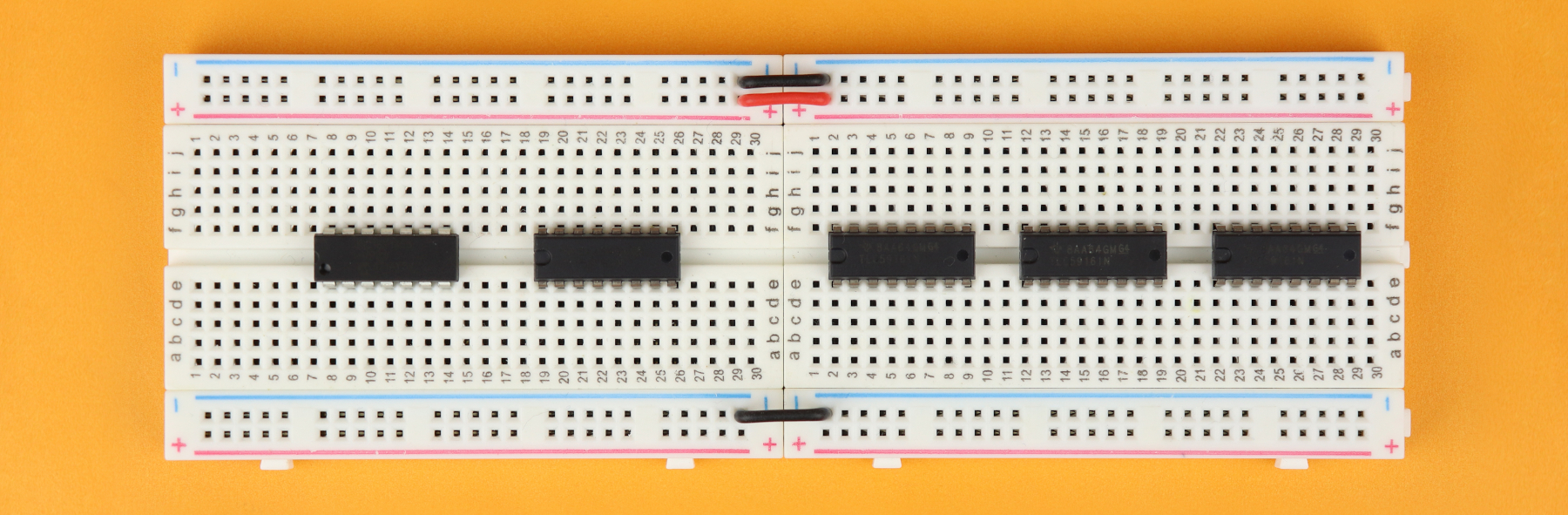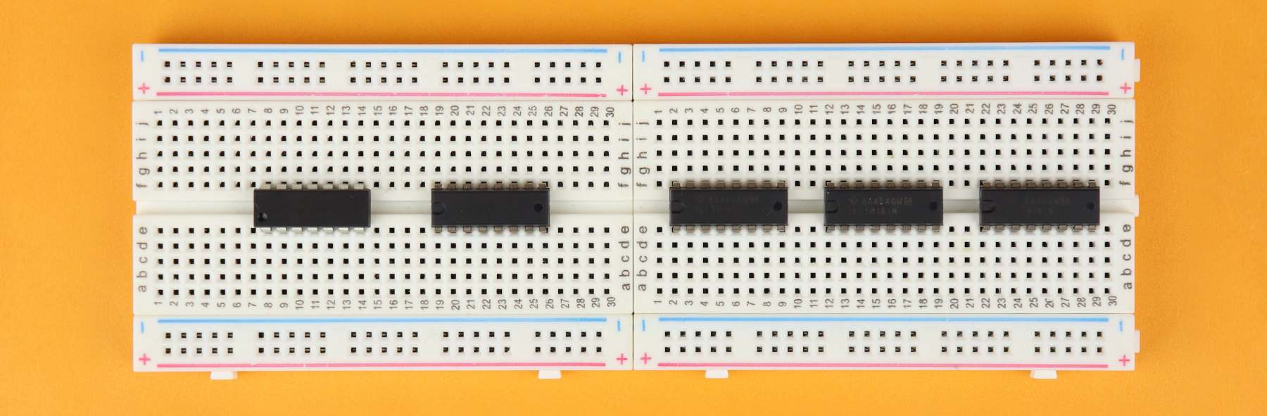 Make sure that row 1 faces left on both breadboards, which makes it easier for you to follow along the rest of the construction guide.
