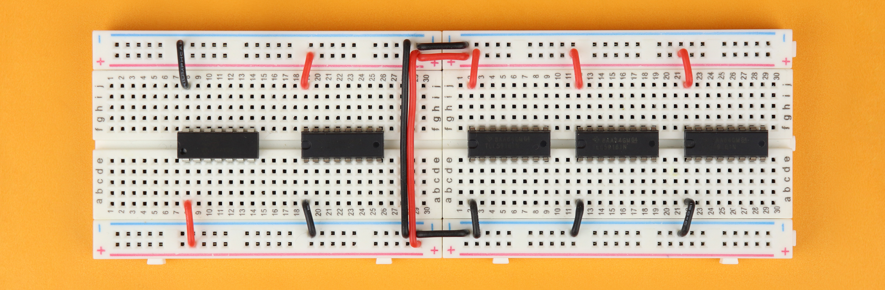 Let's move on to the /OE connection (red). These are all in parallel, and start at pin 5 of the PIC16F1455 and connect to pin 13 of each TLC5916 driver IC. These wires look a bit messy, but that is because I connected them to the same breadboard connection hole to save space.