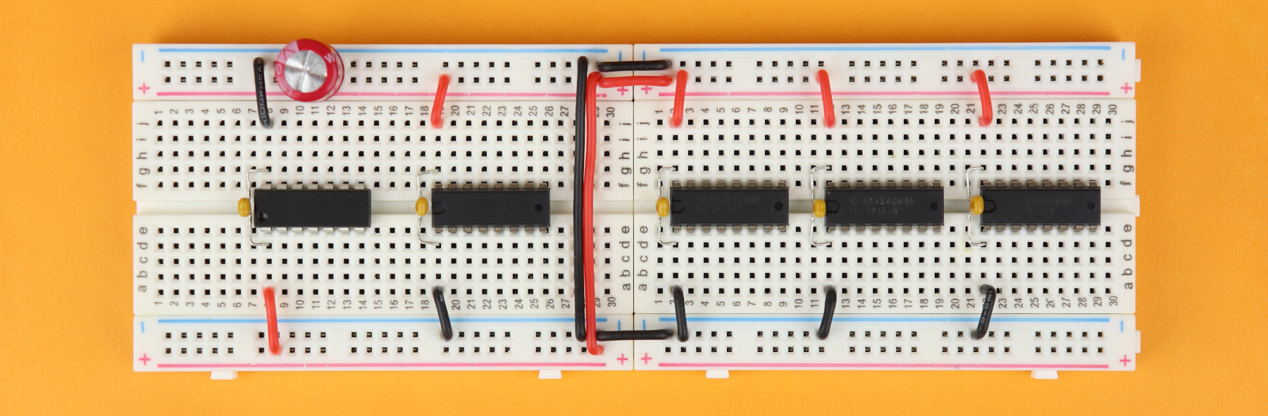 Connect the power rails between the two breadboards. For the upper rail we need to connect both VDD and ground, and for the lower rail it is enough to connect just ground.
