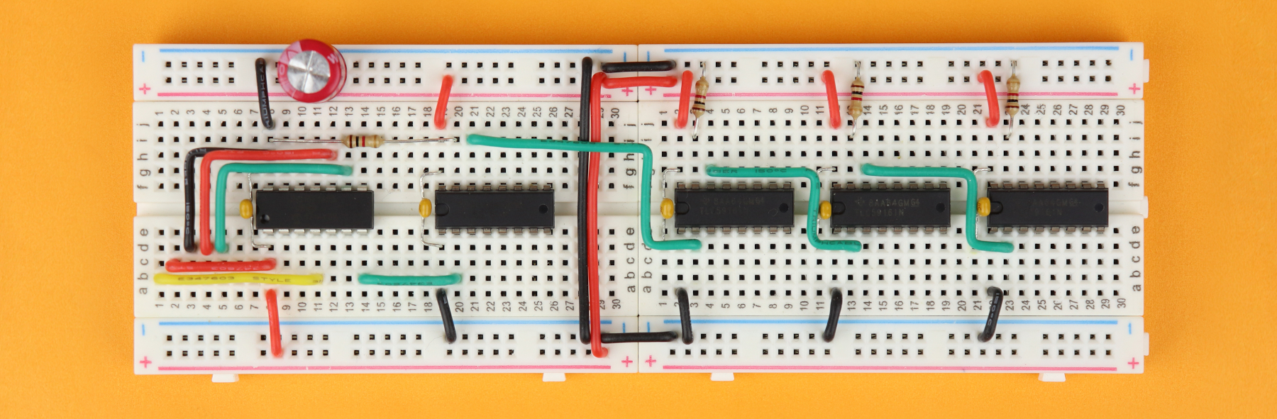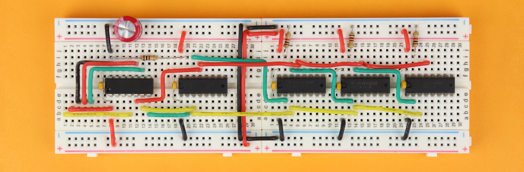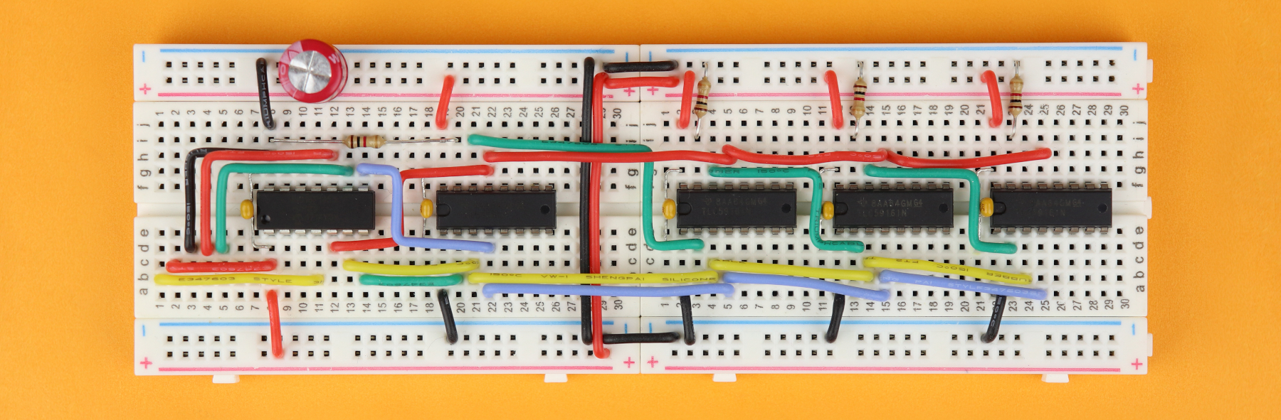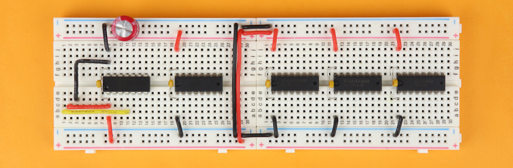 Then, insert the 100nF bypass capacitors C1-C5 between the VDD and ground pins of all the ICs. The capacitors C2-C5 can be plugged in either way, but try to place them as close to their chip as possible.