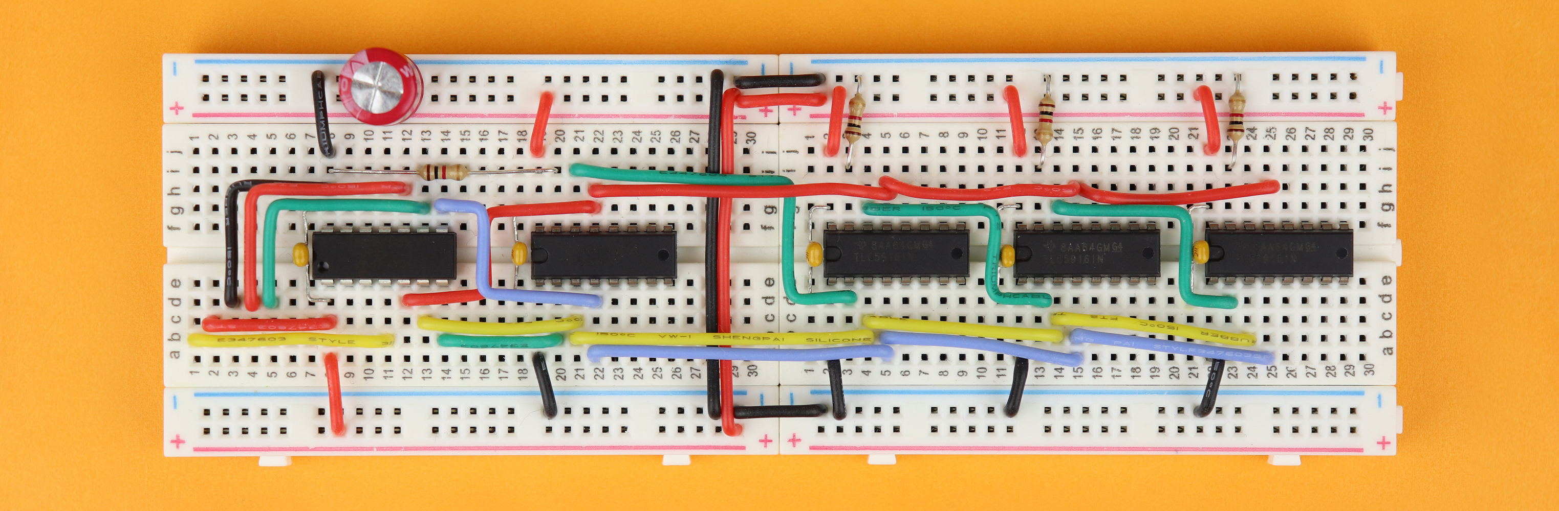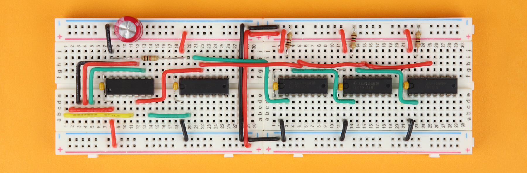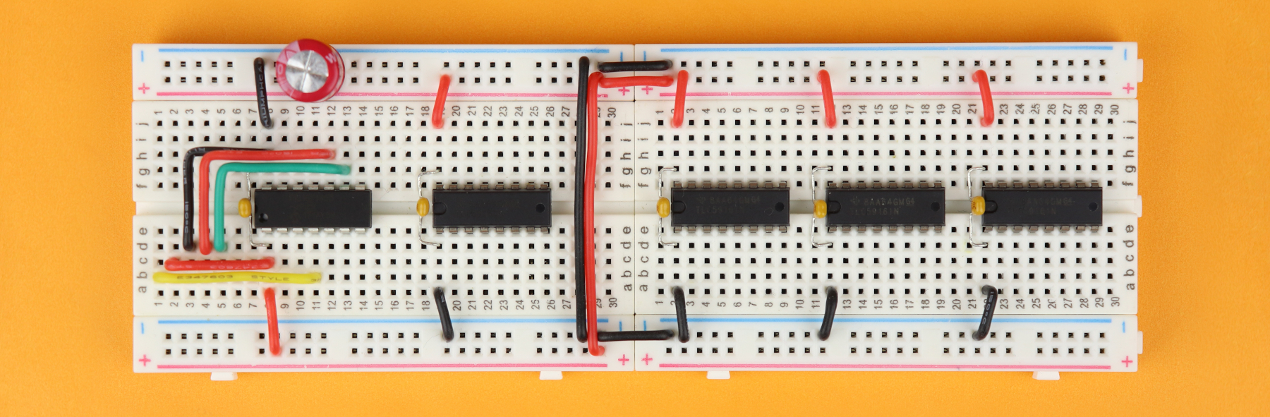 In this tutorial I will show you how to use the TLC5916 driver IC to control as many 7-segment displays that you like. It is a very versatile IC as we will see, and not that difficult to control. And second, I will show you a method to mount 7-segment displays right on top of their TLC5916 driver ICs which allows for a super clean and space-saving breadboard layout: