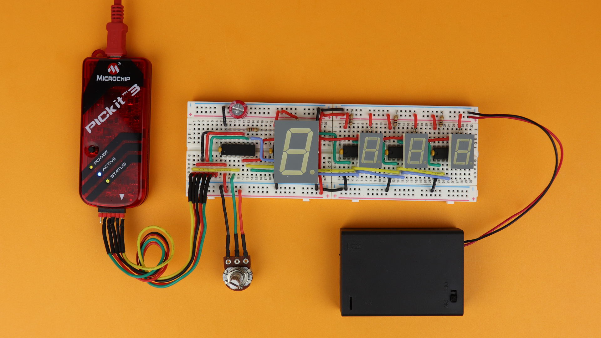 And that's it! Just one final note: make sure that your power supply can handle the current. A 7-segment display can consume up to 160mA (20mA per segment plus the decimal point), so the current adds up quickly. So why am I using batteries to drive this circuit? Surely they will drain in no time! Yes, you are right. I decided to use batteries to keep the circuit simple and compact, but if you want to use this circuit in the real world then you should definitely use a dedicated power supply.