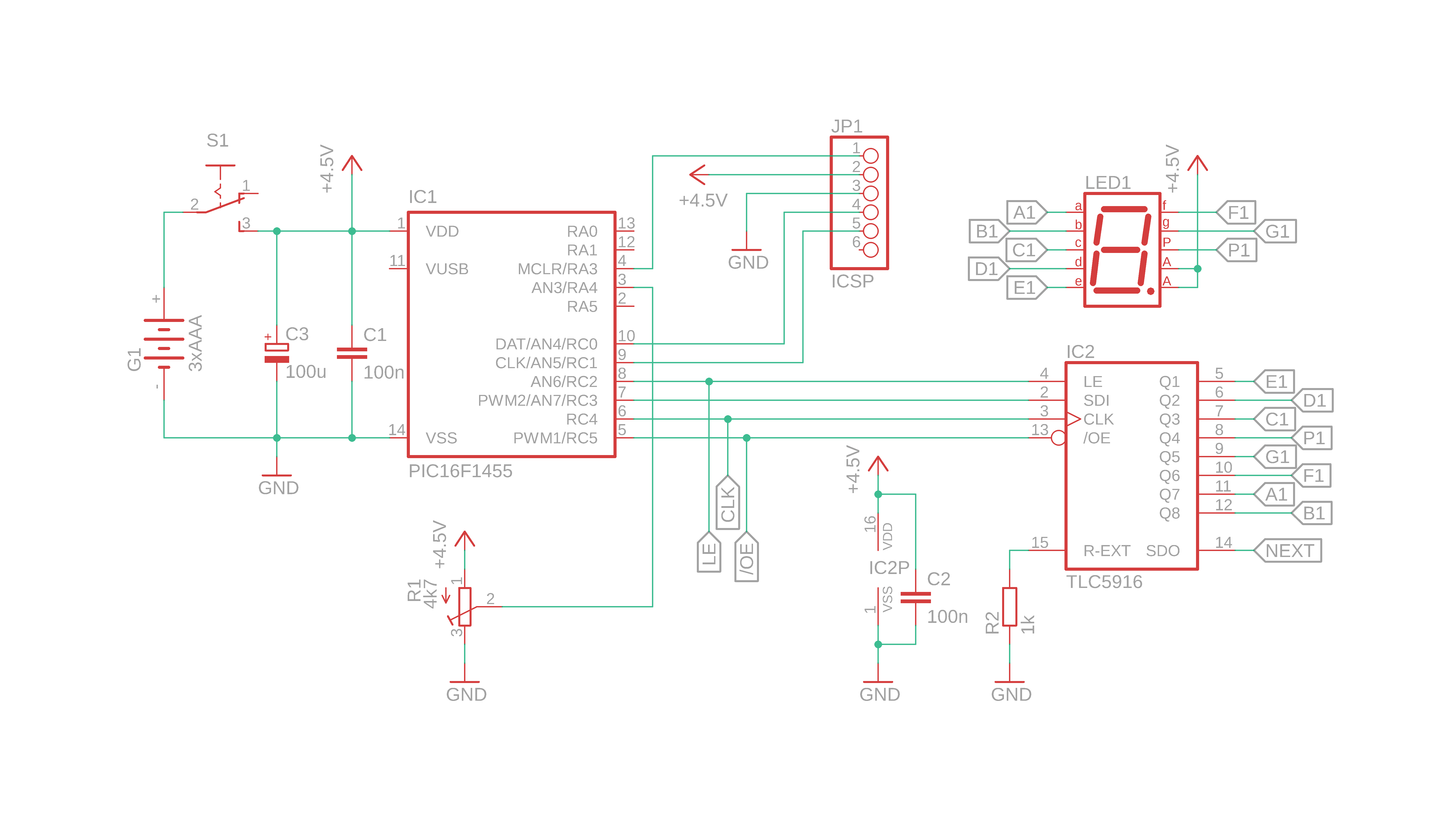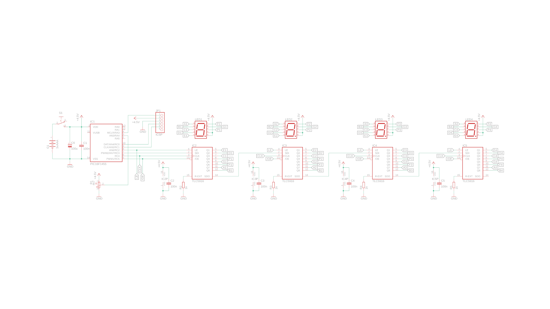 - The PIC16F1455 is the brain of this circuit and sends out the display data to the TLC5016 driver IC over the data lines SDI, CLK, LE, and /OE. I will talk more about those in a second :)