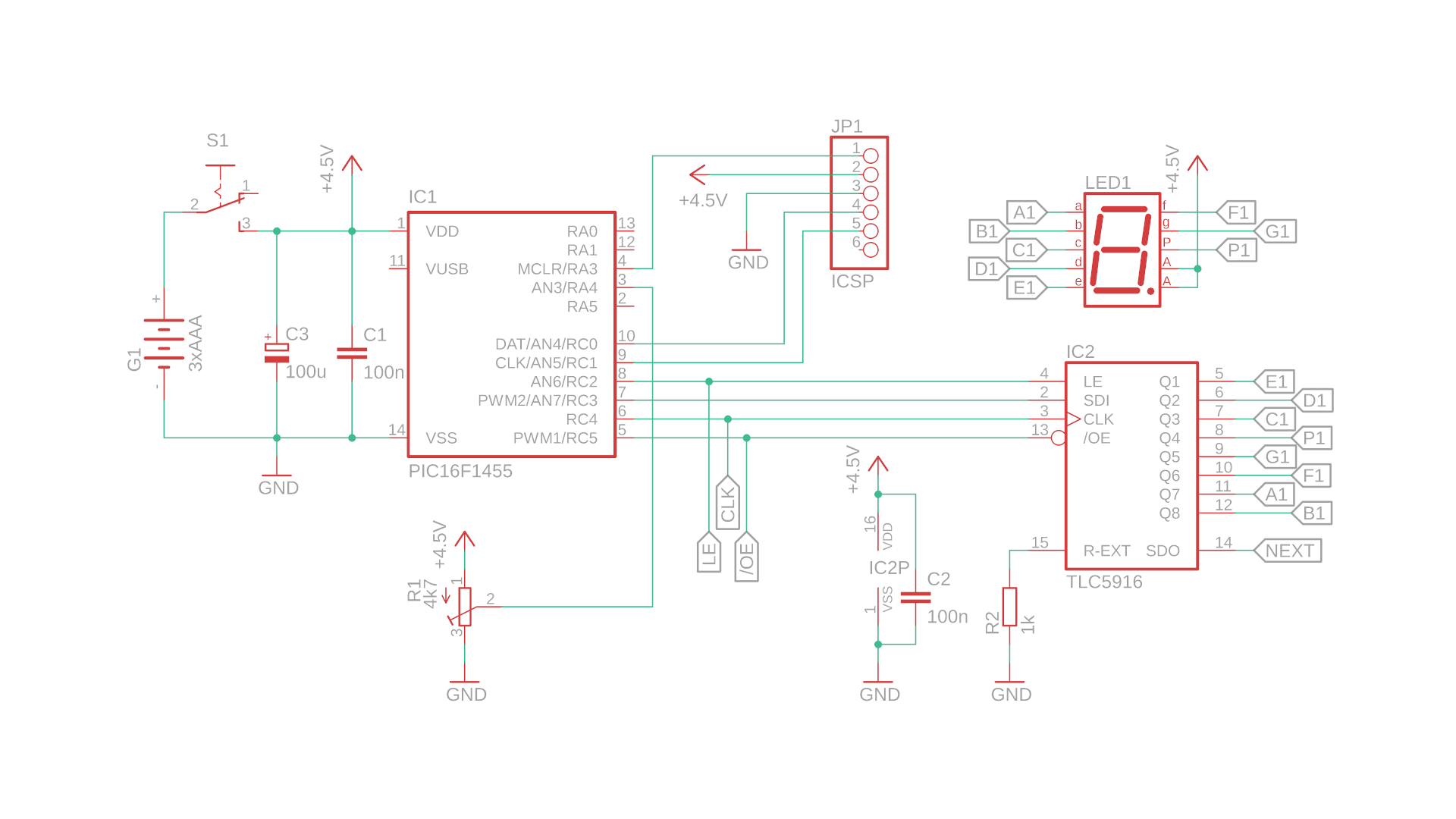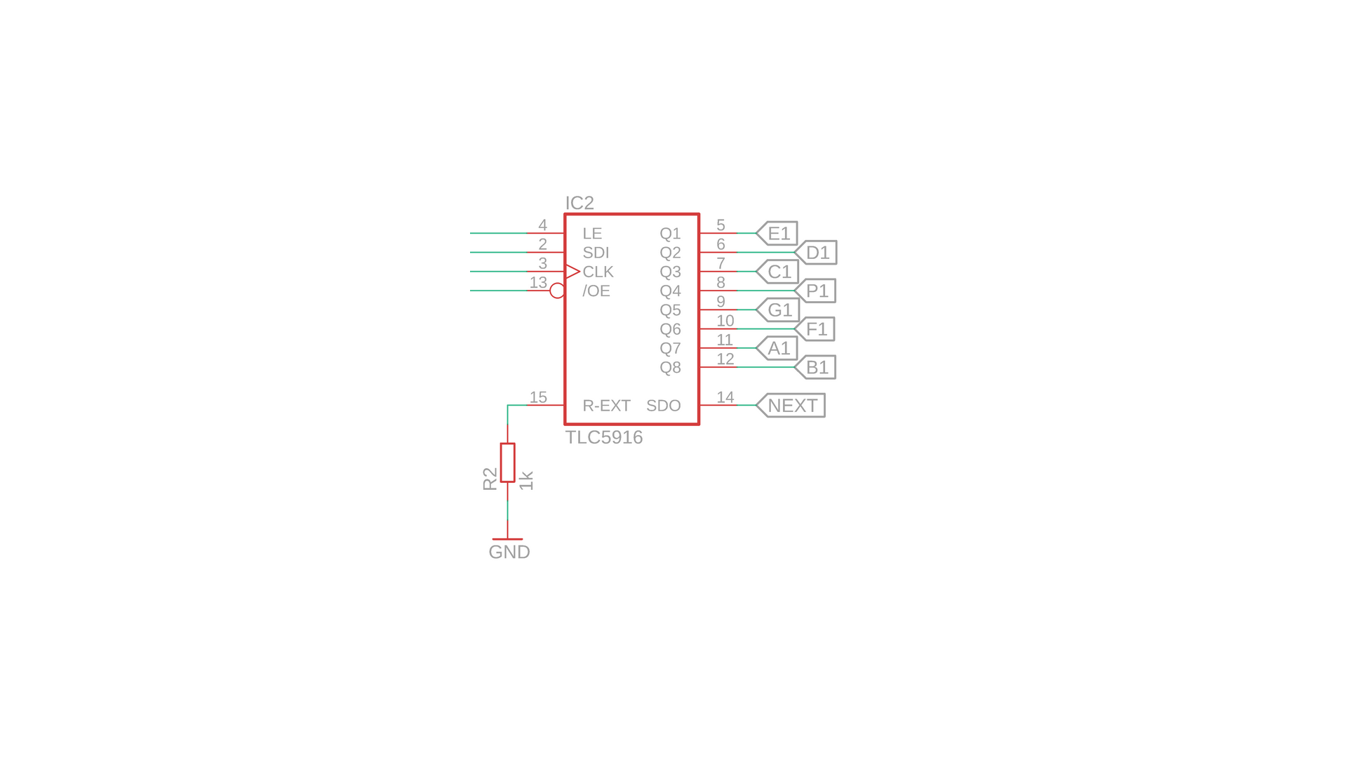 - IC2 is the TLC5916 driver IC, the star of the show. Its outputs Q1-Q8 are connected to the 7-segment display's LED cathodes, and these outputs can sink a current that is adjusted by the resistor R2. More on that later.