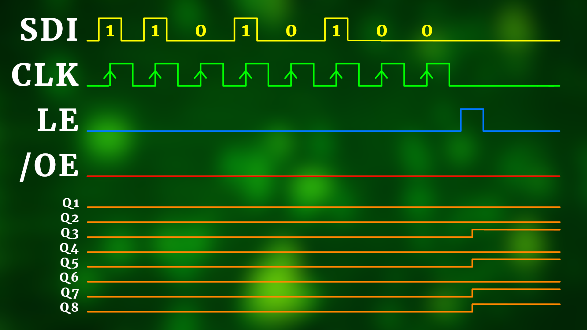 We start with the most significant bit and end with the least significant bit. We always set SDI to the current bit, and then pulse CLK from 0 to 1 and then to 0 again. After doing this eight times, we also pulse the LE pin. If /OE is low, the data then appears on the outputs Q1-Q8 (here in orange).