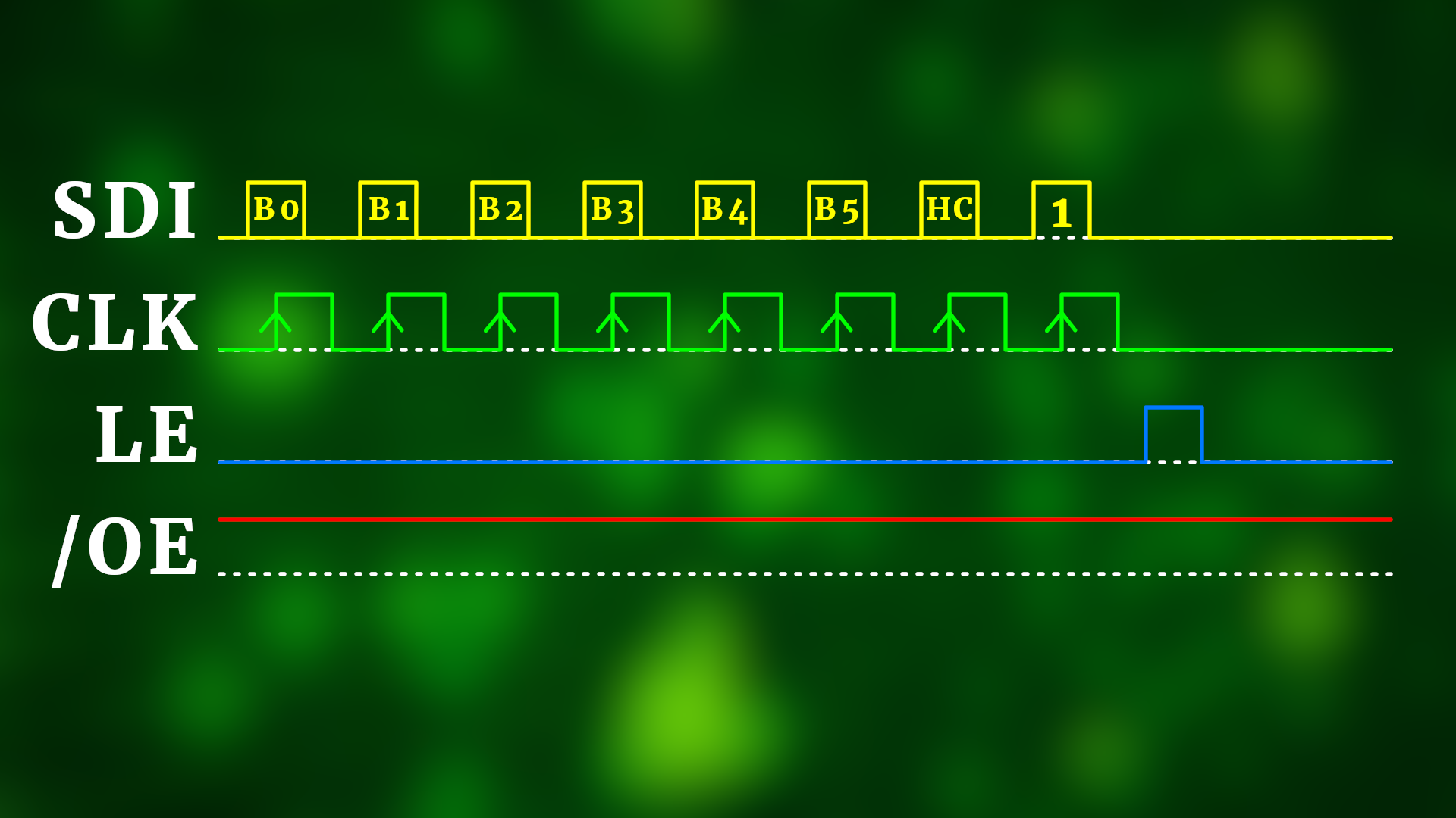 Then the TLC5916 is in special mode, and we can transmit seven values that control the current. I call B0-B5 and HC. This is how we send them: