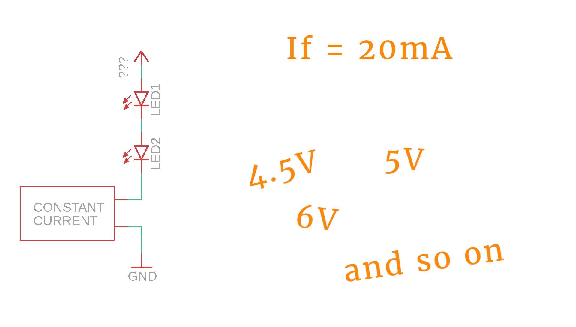 - LEDs have a forward voltage (read more here) which is their minimum voltage required to start glowing. Clearly the supply voltage must be larger than that. If you have LEDs in series, these voltages add up, so keep that in mind. Two LEDs with 2.2V forward voltage each require at least 4.4V of supply voltage, and so on.
