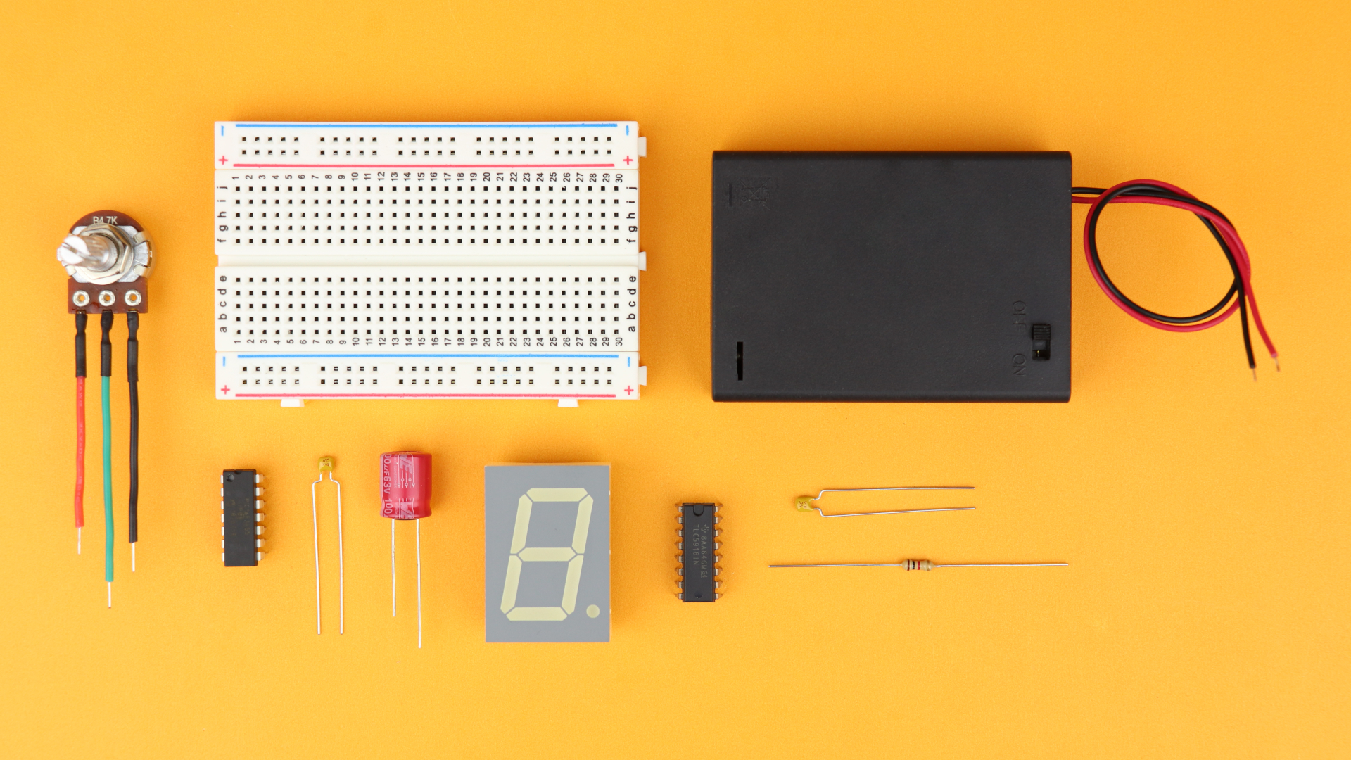 - For each digit you want to display you need a common anode 7-segment LED display (more on that later), a 1kΩ resistor, the TLC5916 driver IC, and a 100nF bypass capacitor for stability.