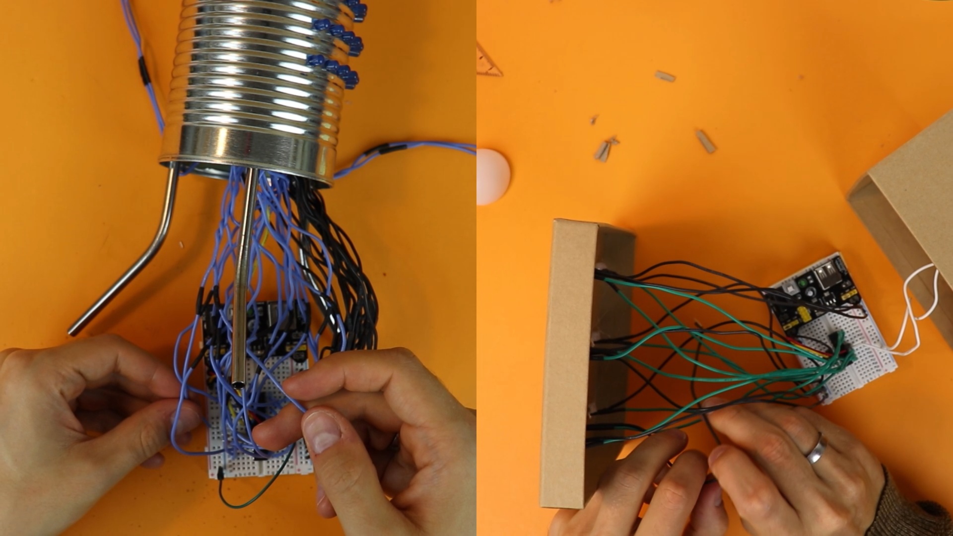 These two projects are the binary clock (left) and the electronic dice (right) that we have built on this channel using conventional LEDs, and they involve a lot of wiring. I personally don't mind it that much, but it can get a bit messy. This is where the WS2812 LEDs come in