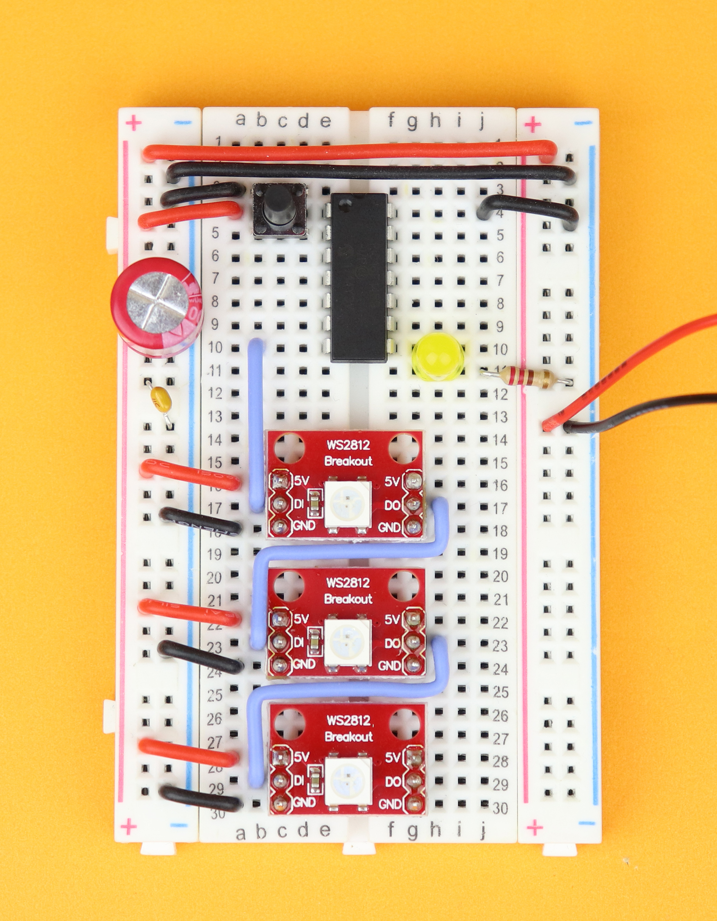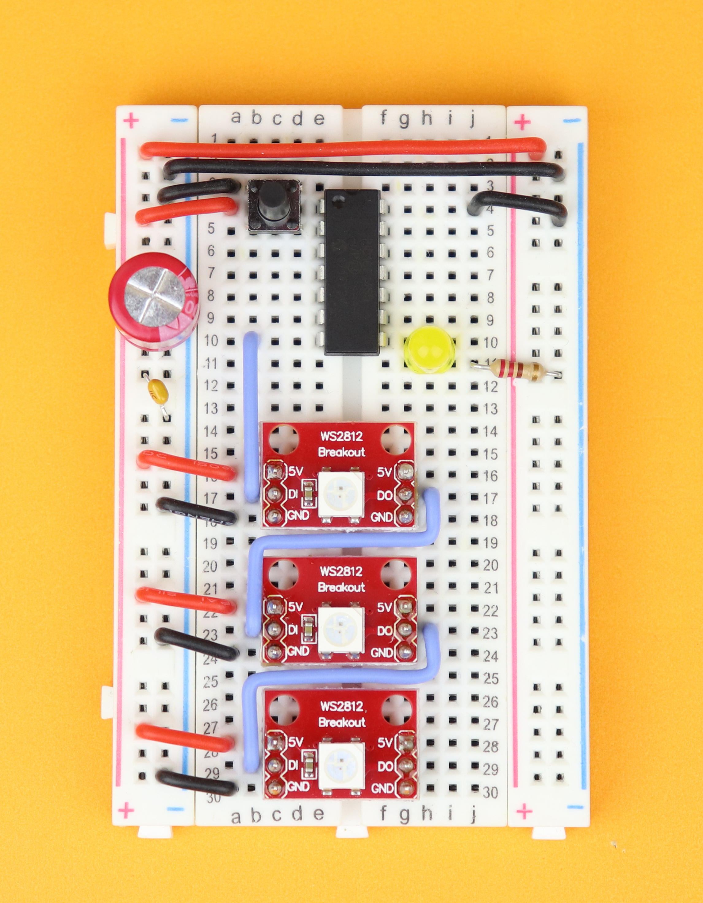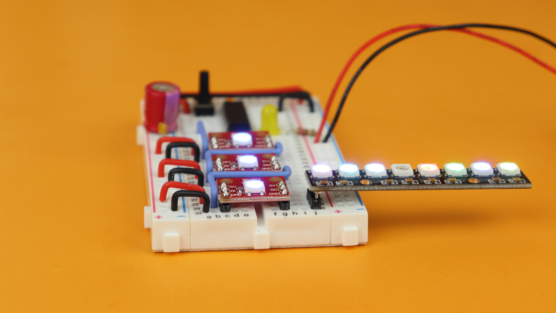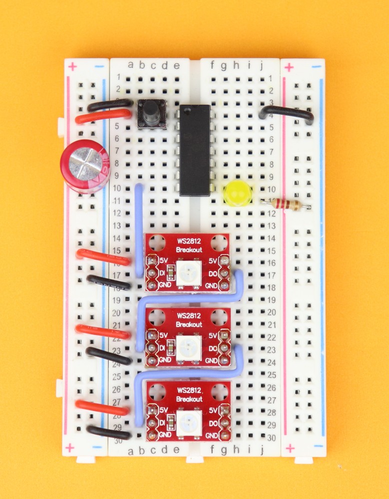 Insert the three WS2812 LED modules in rows 16, 22, 28.