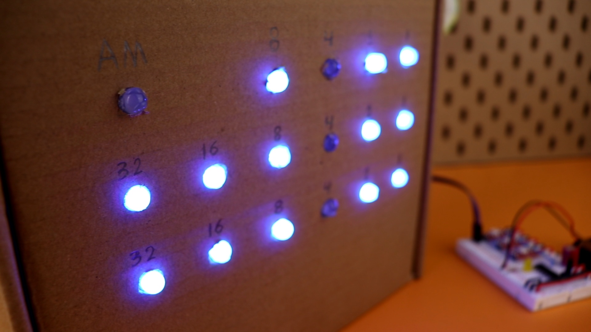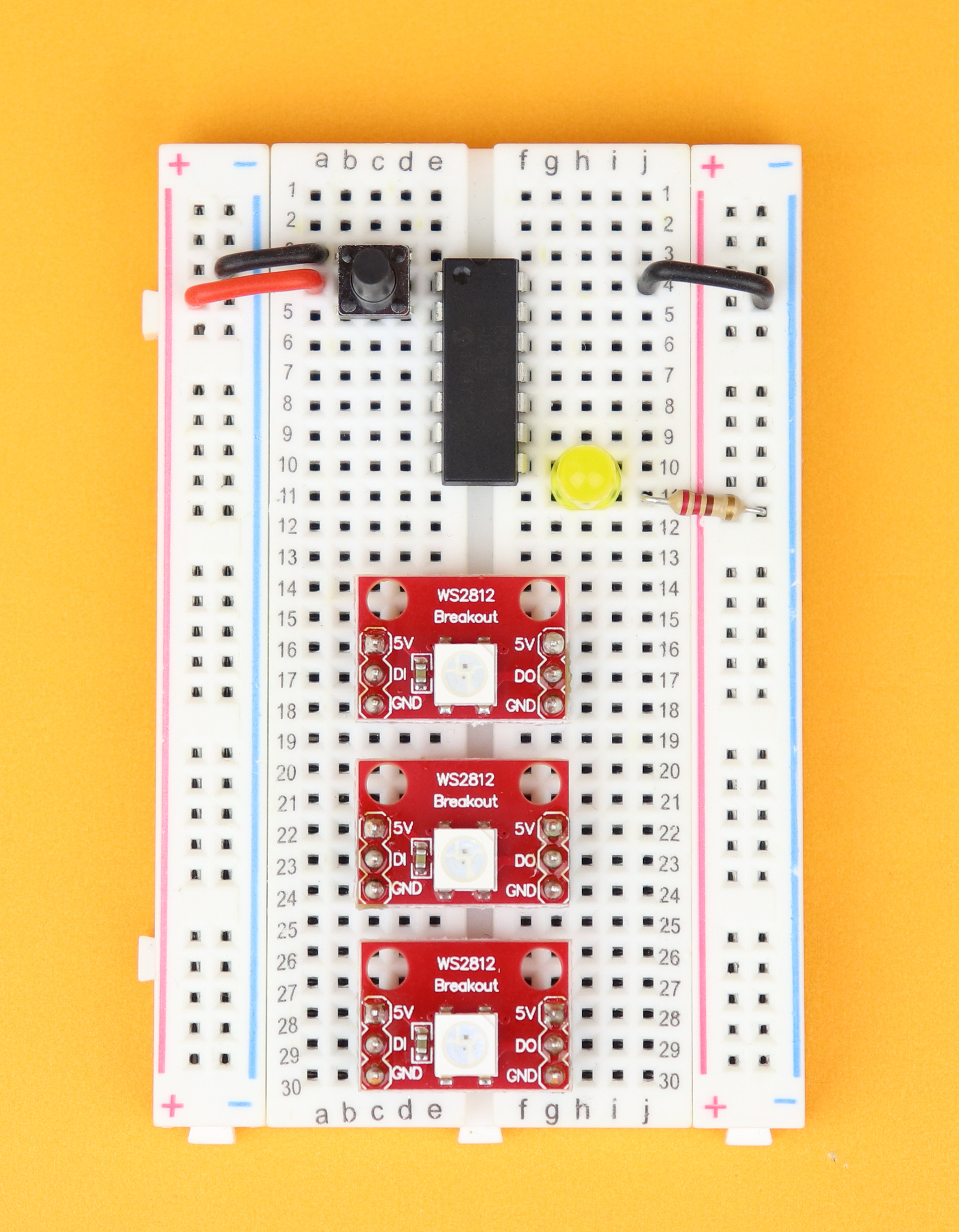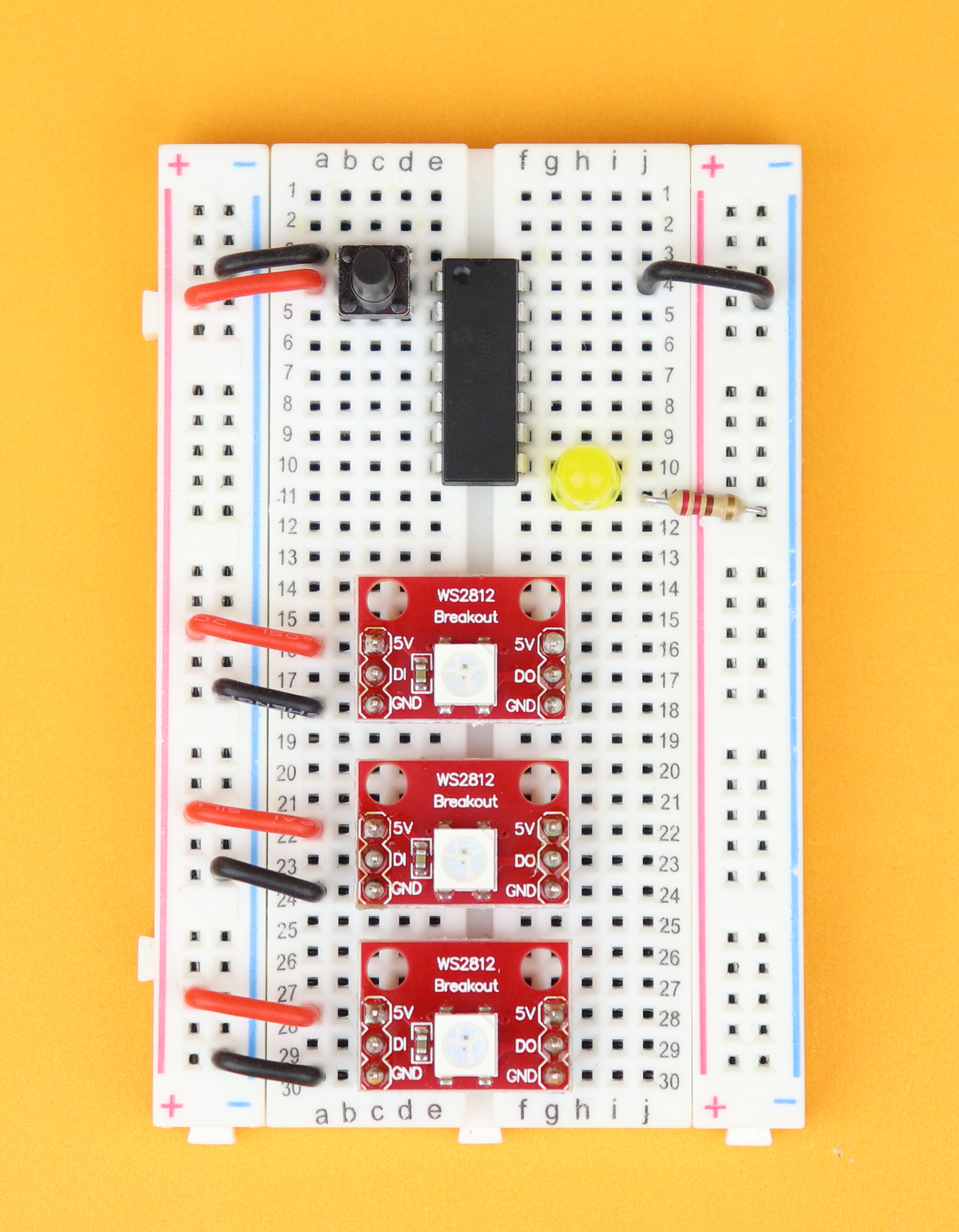 Insert the three WS2812 LED modules in rows 16, 22, 28.