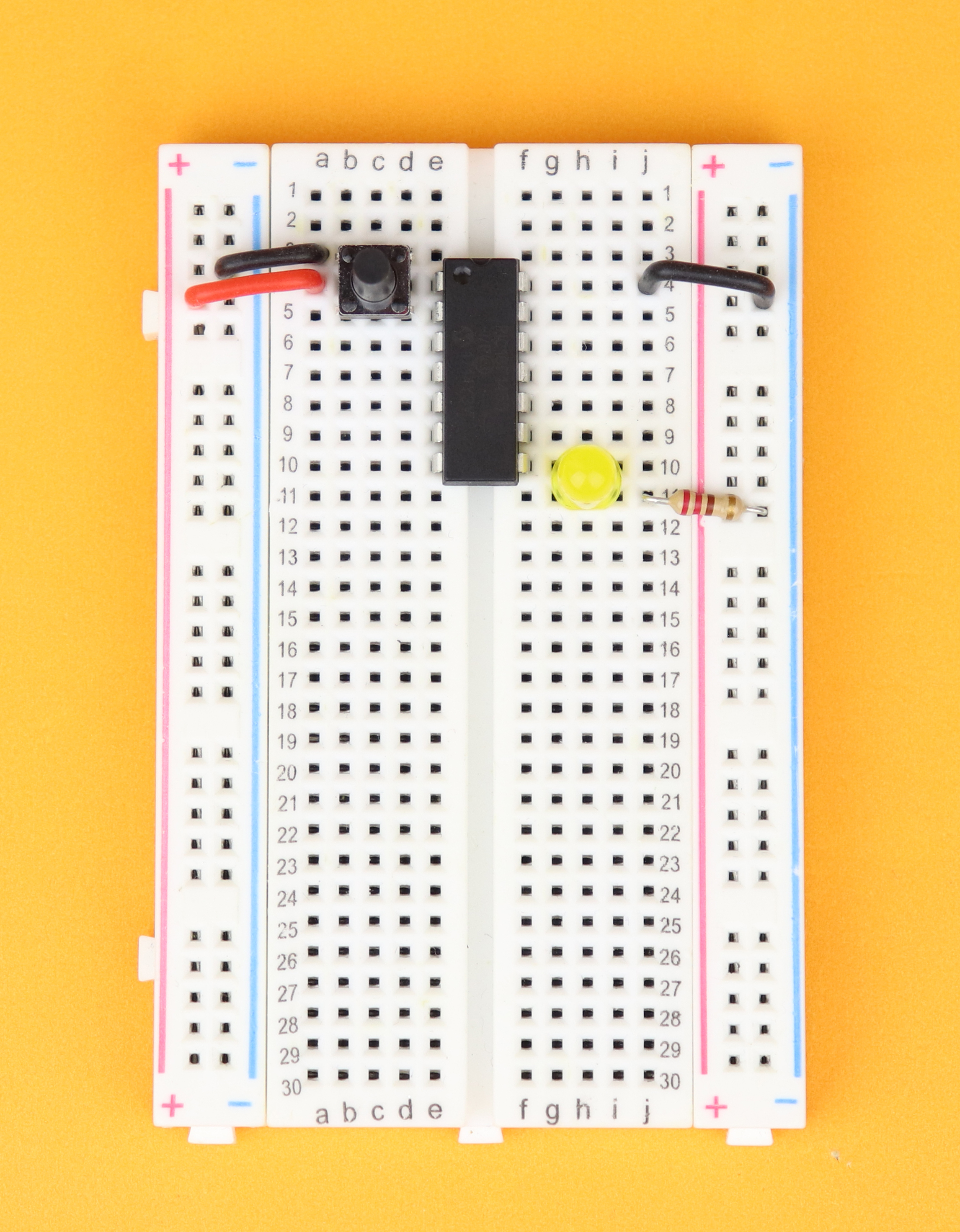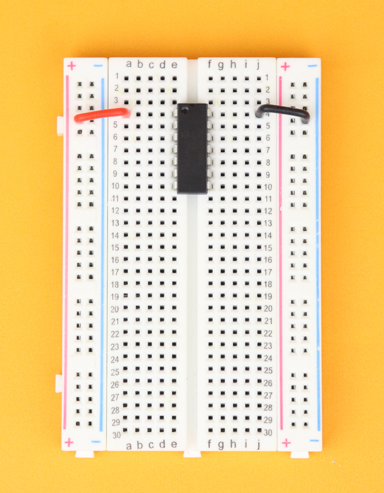 Place the breadboard in front of you, with row 1 facing to the top. Place the PIC16F1455 in row 4, and make sure the notch points towards row 1 of the breadboard. Connect pin 1 to the positive power rail, and pin 14 to the negative power rail.