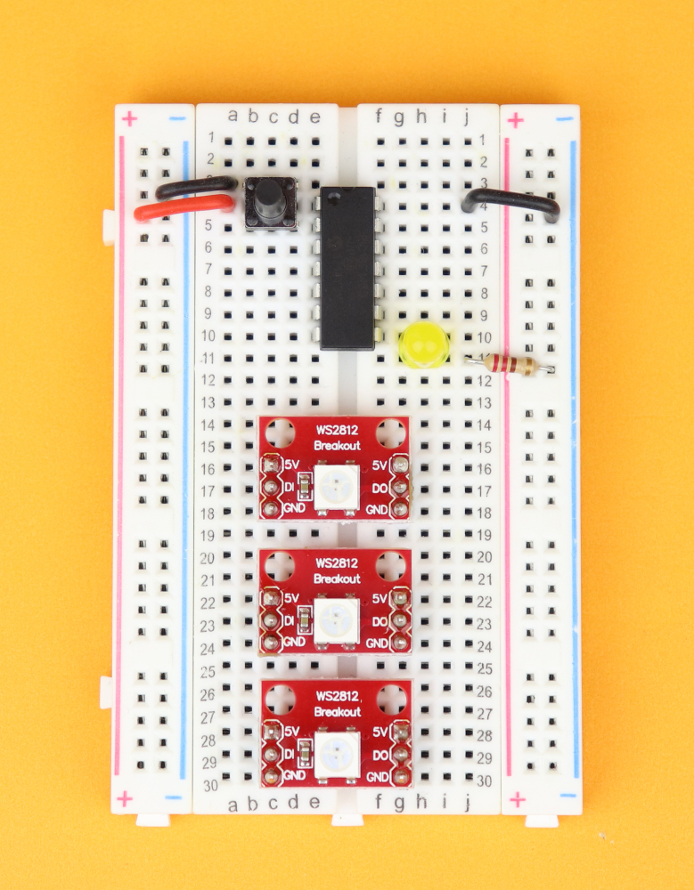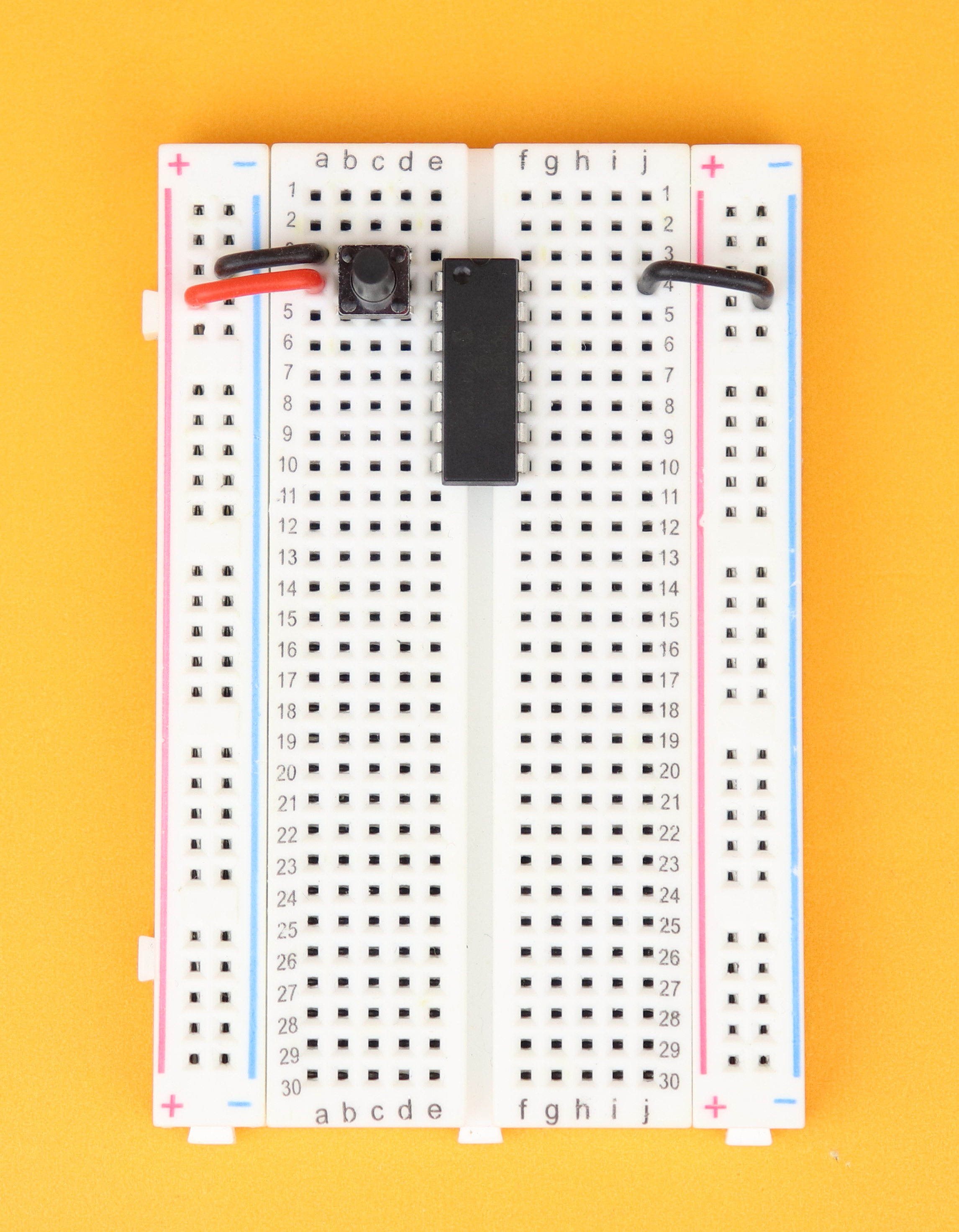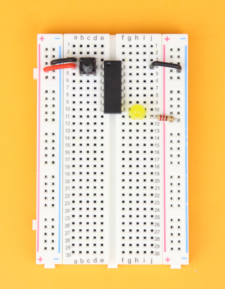Insert the pushbutton between rows 3 and 5, and connect the upper terminal of the pushbutton in row 3 to ground.