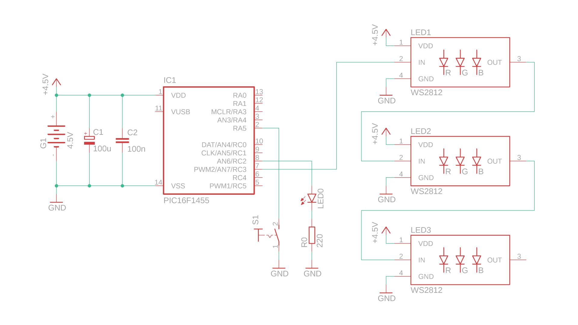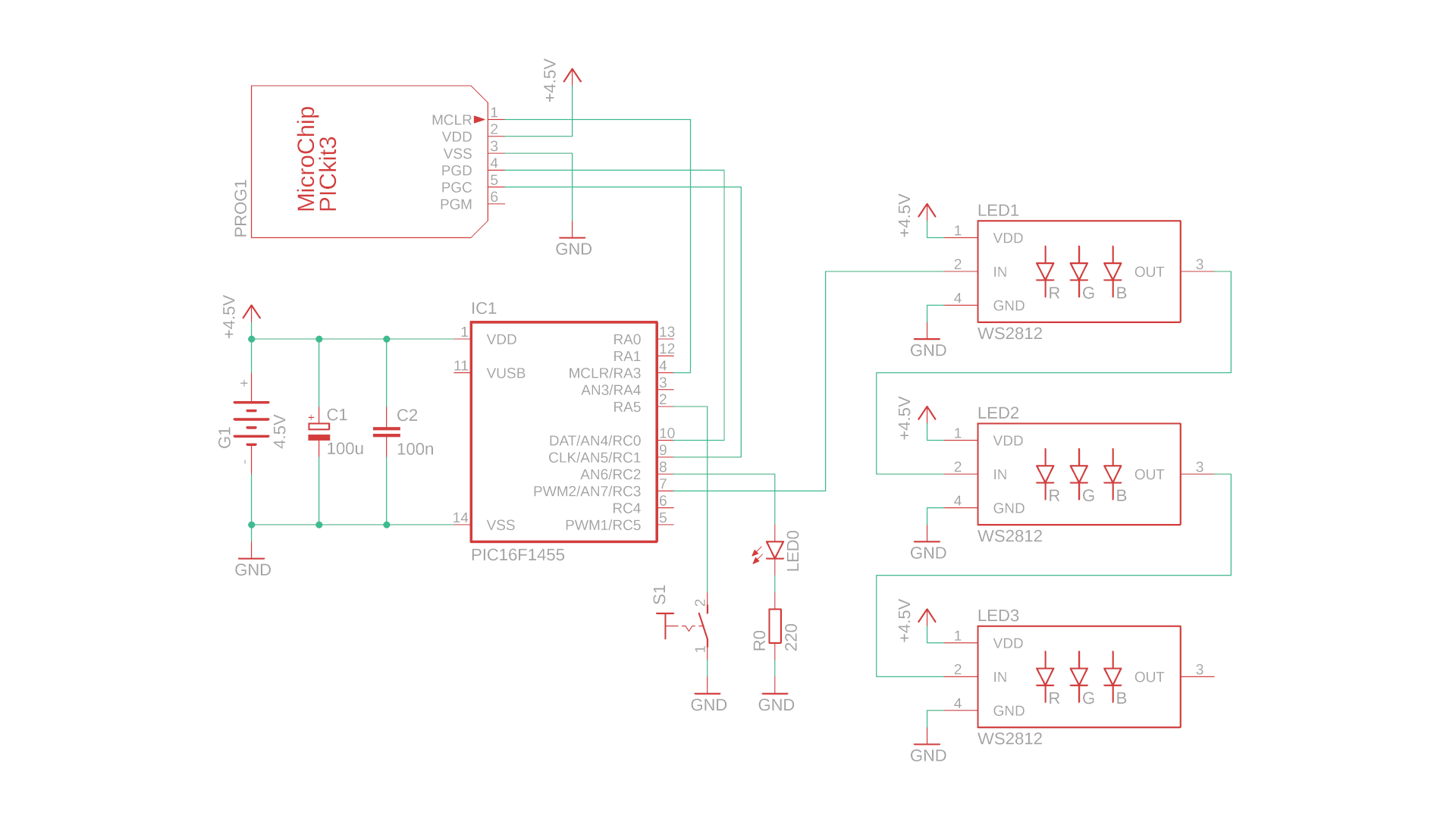- IC1 is the PIC16F1455 that controls the WS2812 LEDs, and here we just use three of them but you could use many more if you want. The data signal comes from pin RC3 and travels through all three LEDs.