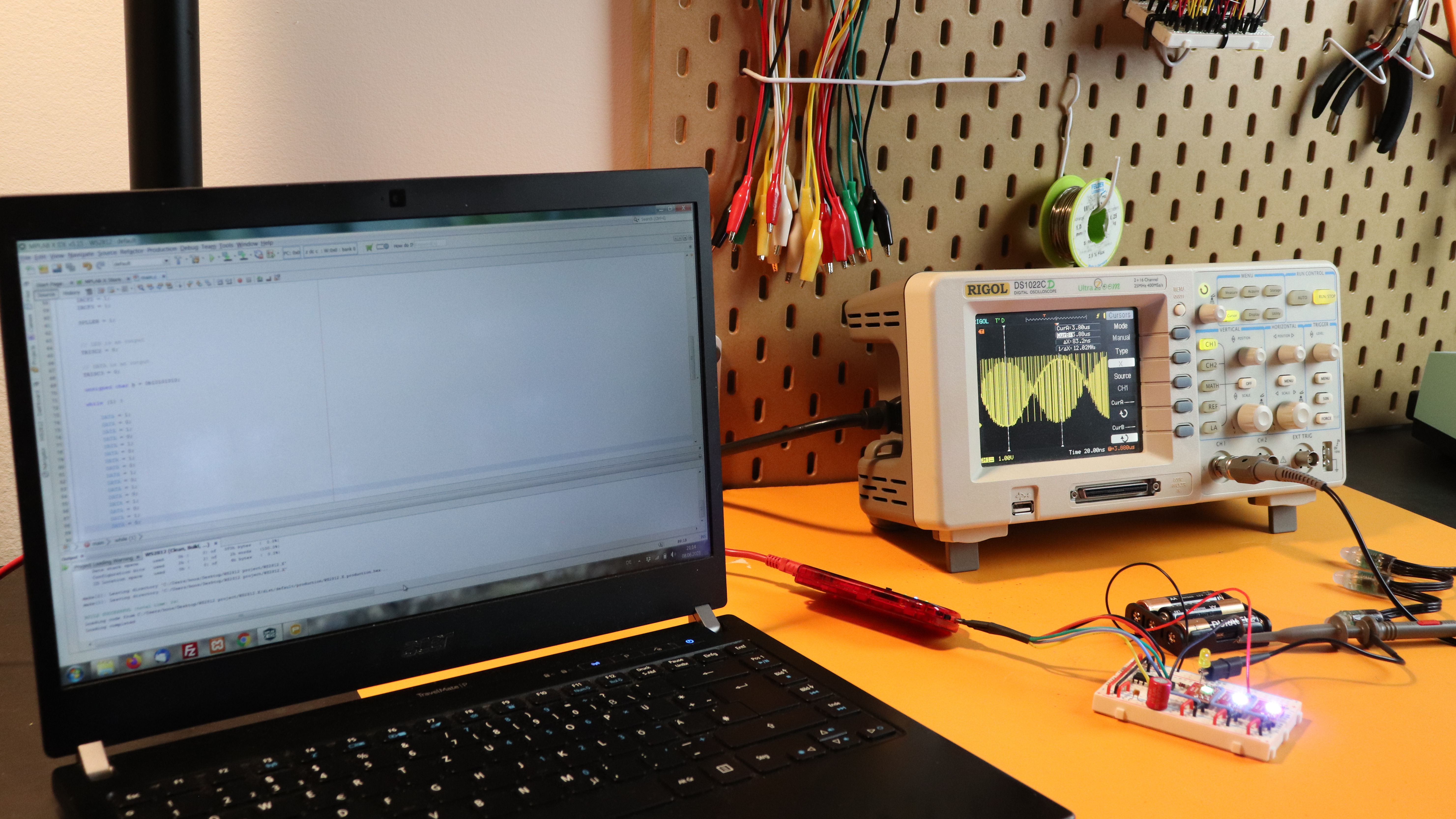 Then, for now, just delete everything you see in that window and just copy & paste the source code from below, and compile the code to a .hex-file, and flash that .hex-file onto the PIC16F1455. Then your breadboard should give you a little light show, something like that: