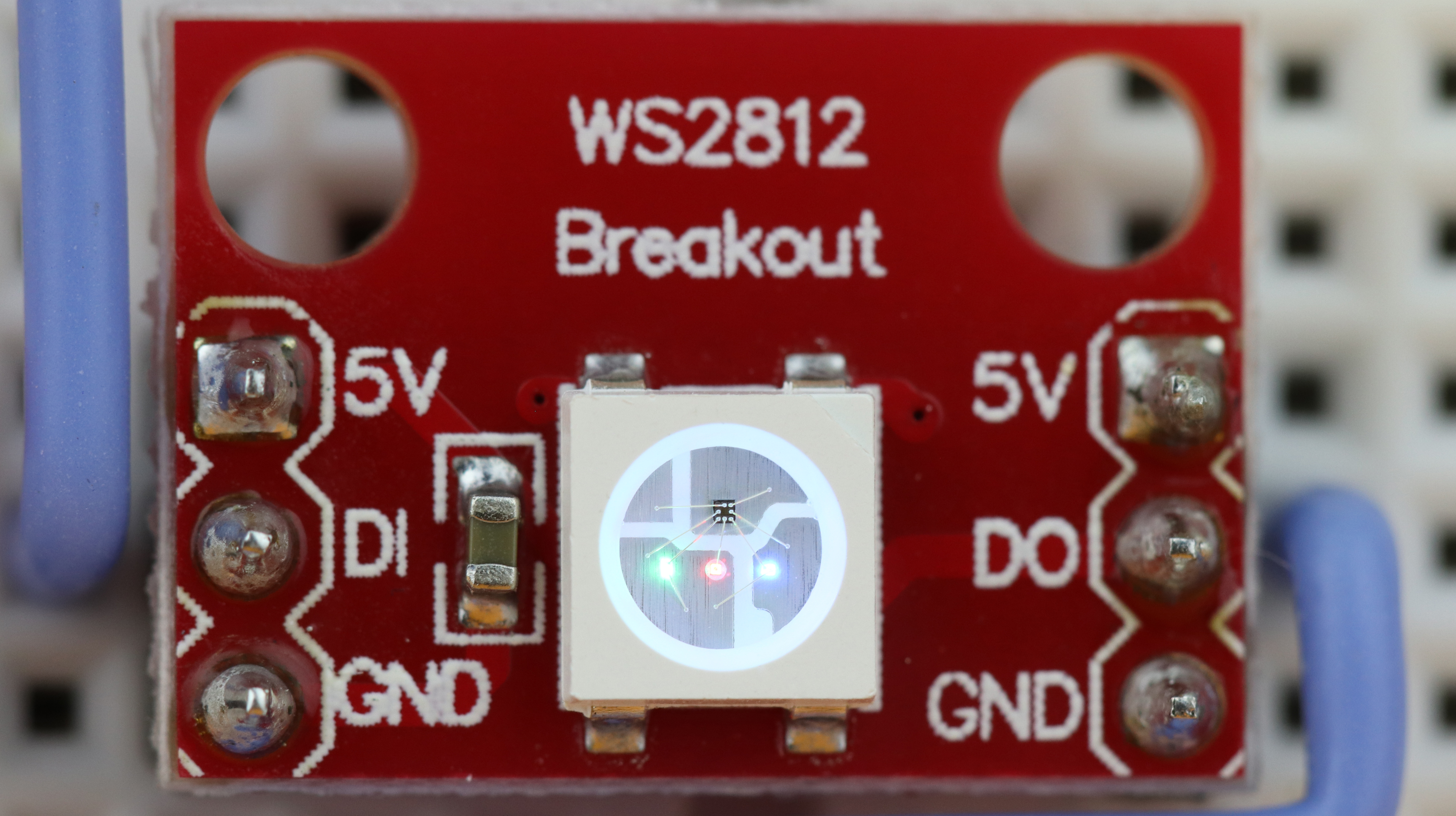 When you zoom in you can see that a WS2812 NeoPixel LED is actually a combination of a red, green, and blue LED, together with a driver chip. Each module has four connections:
