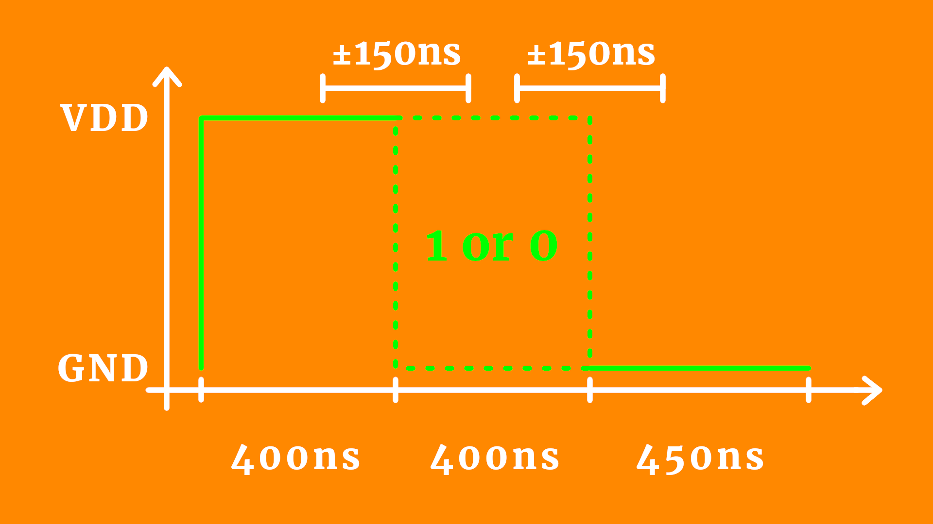 So a 1 is sent by a 800ns high-pulse and a 450ns low signal, and a 0 is sent by a 400ns high-pulse and a 850ns low signal. So you see that the bit information is indeed encoded in the middle 400ns period.